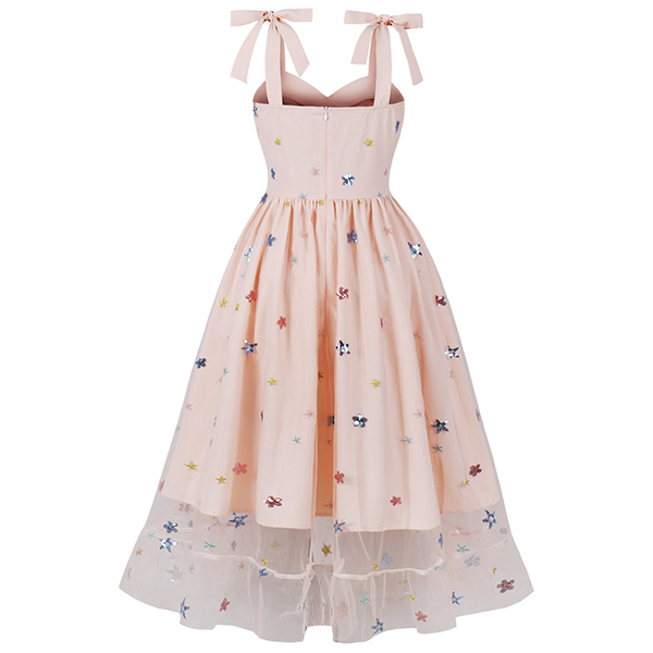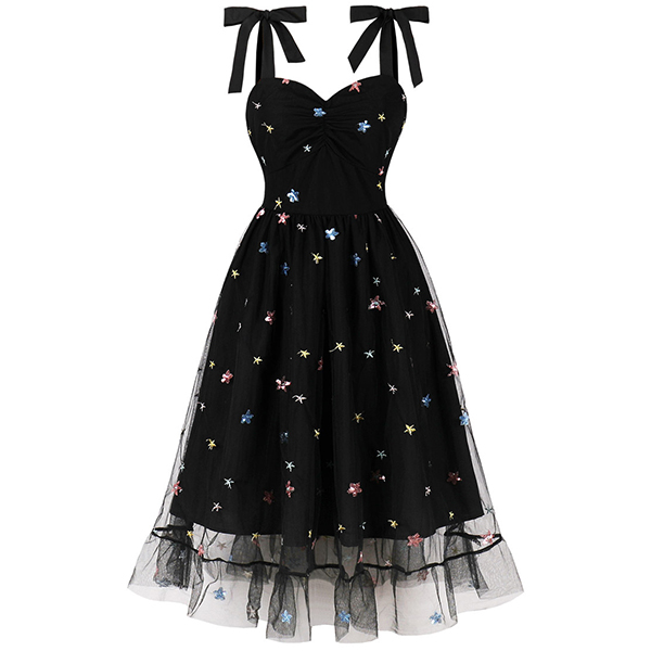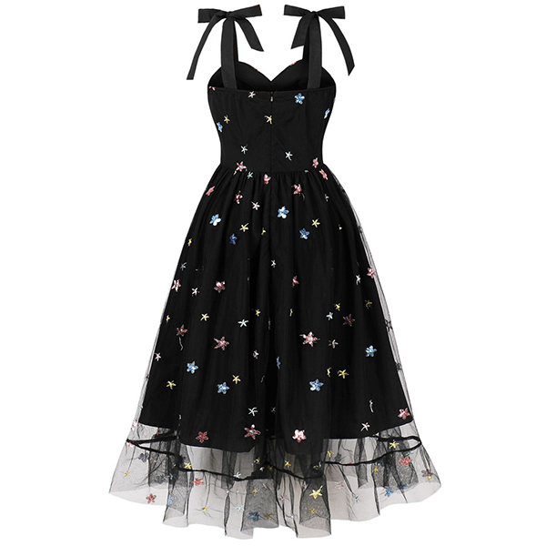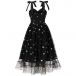 Look at this party dress! The star pattern adds a whimsical, cosmic touch to the design. The sweetheart neckline is a classically feminine and flattering silhouette.The tutu-style skirt brings a fun, playful element to the dress. Perfect for party wear!