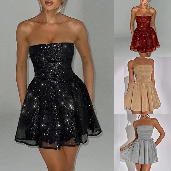 Look at this party dress! The bling-bling detailing adds a touch of sparkle and glamour to the dress. The strapless design showcases your shoulders and neckline, creating a sexy and feminine silhouette.Pair it with high heels and statement accessories for a glamorous and head-turning look.