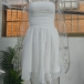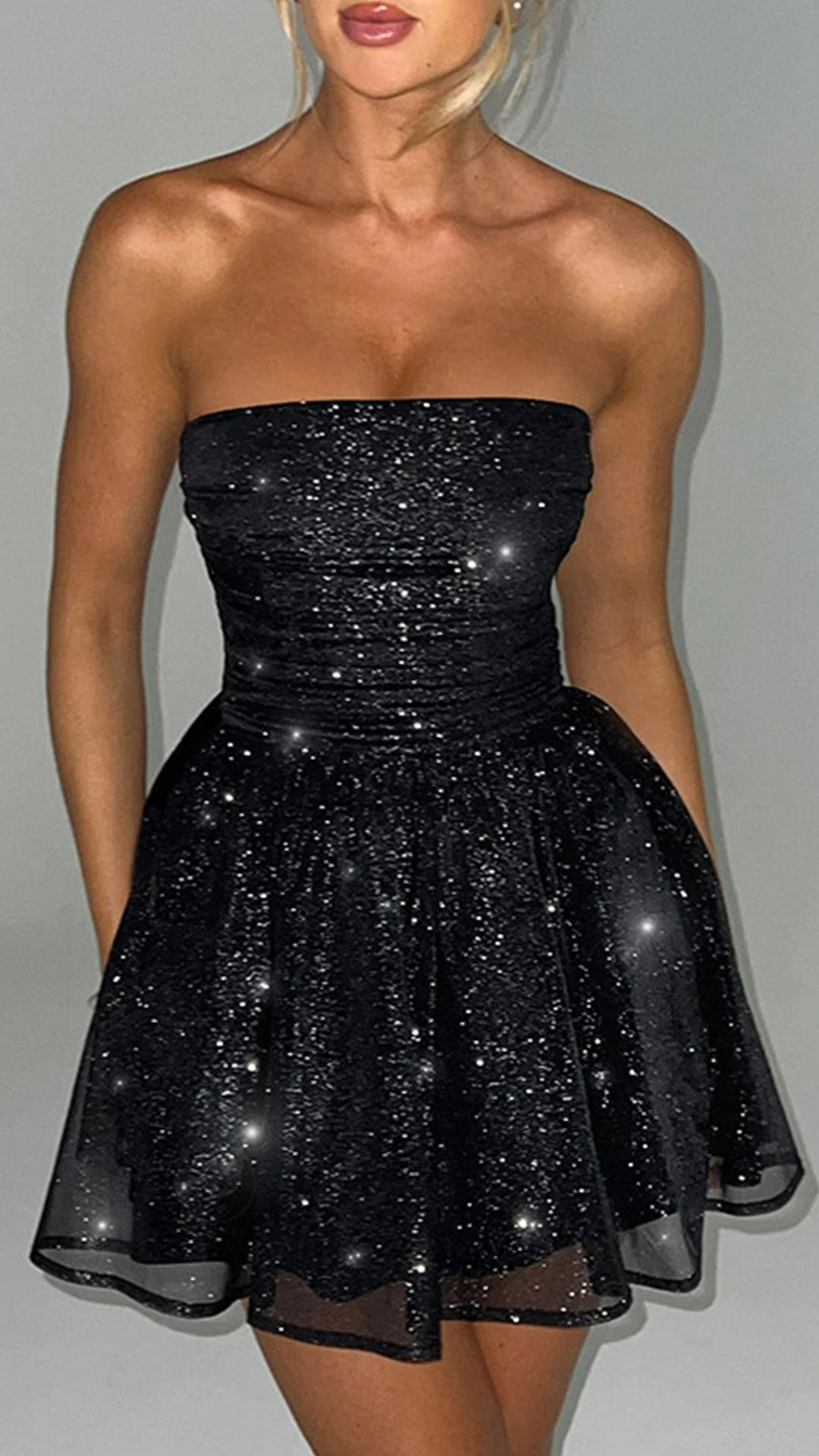 This dress features a strapless neckline, a fitted bodice adorned with shimmering bling-bling embellishments, and a flirty ruffle hemline that adds movement and style to the design. Perfect for party wear.