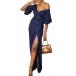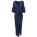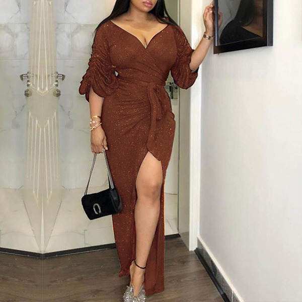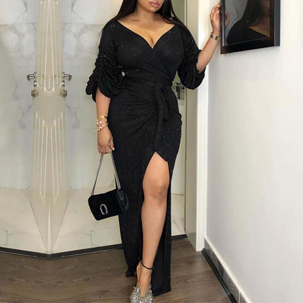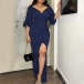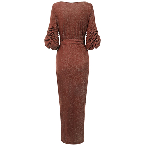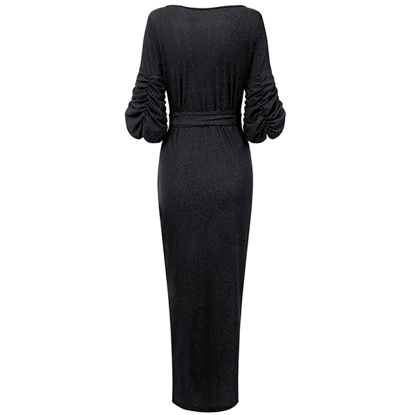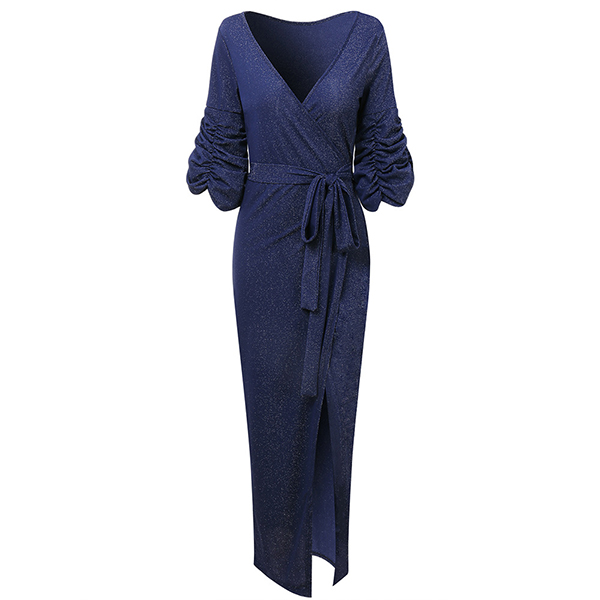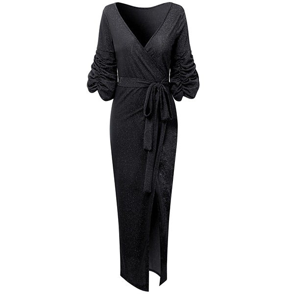 Sexy Bling-bling V-neck Ruched Drape Short Sleeve Self-tie Slit Party Dress
