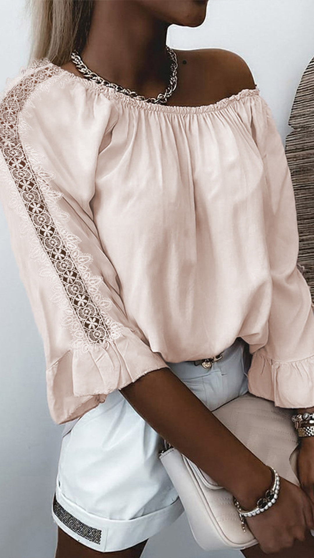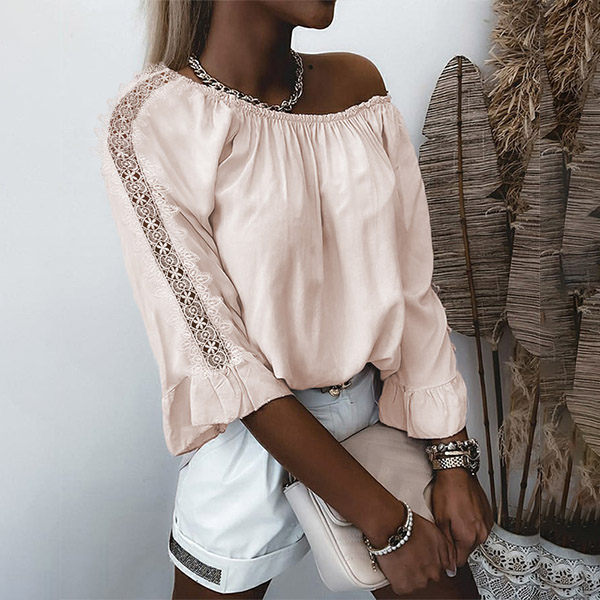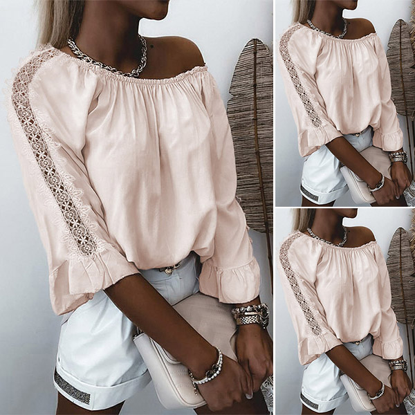 Combines of sassy and flirty vibes,this wonderful top can easily strike your mind. The off-shoulder design gives you the chance to showcase your charming shoulder and seductive collarbone. And the lace spliced details at the sleeve part will further enhance the charm. You can match with a sparkle choker necklace if you wanna look more beautiful!