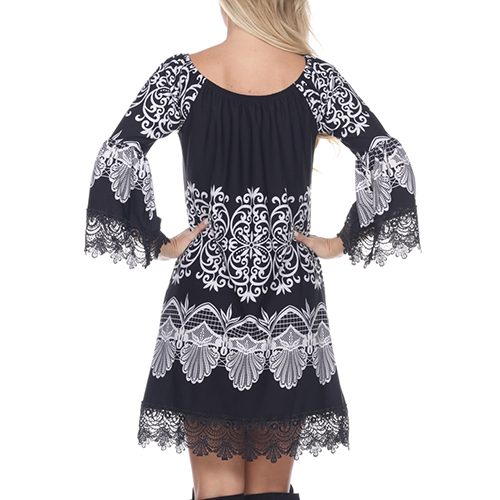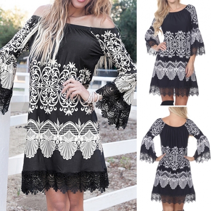 This dress knows how to keep you looking charming and feminine. Features chic and eye-catching printed pattern,designed with boat neck and trumpet sleeve,delicate and charming. And its lace spliced details makes this piece more feminine. Obviously,this dress can give you a charming look.