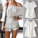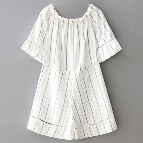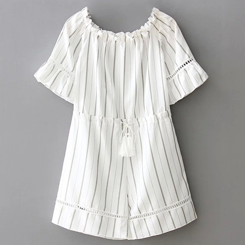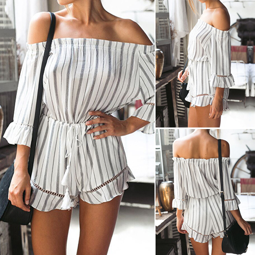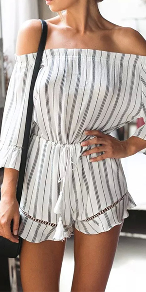 boat neck,sweet trumpet sleeve and an elastic drawstring waist,this romper is perfect for you to