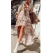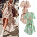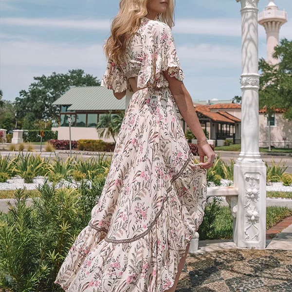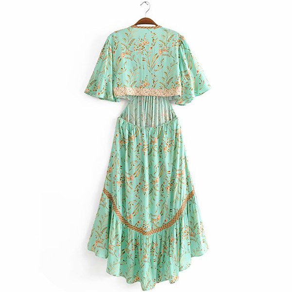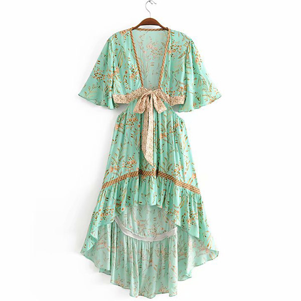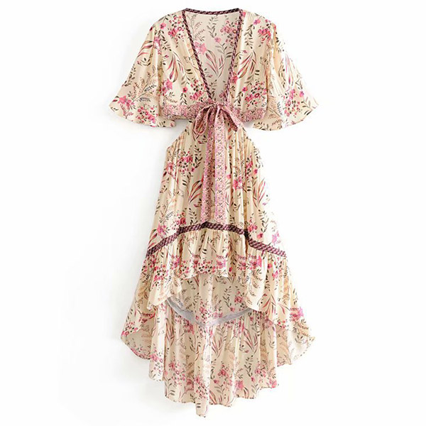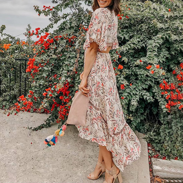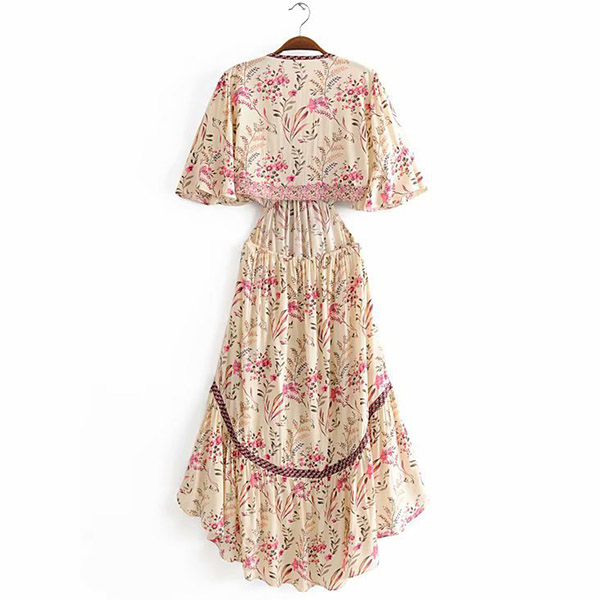 Sexy Bohemia Style Floral Printed Plung V-neck High-low Hemline Cutout Beach Dress
