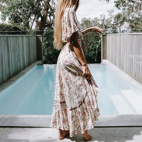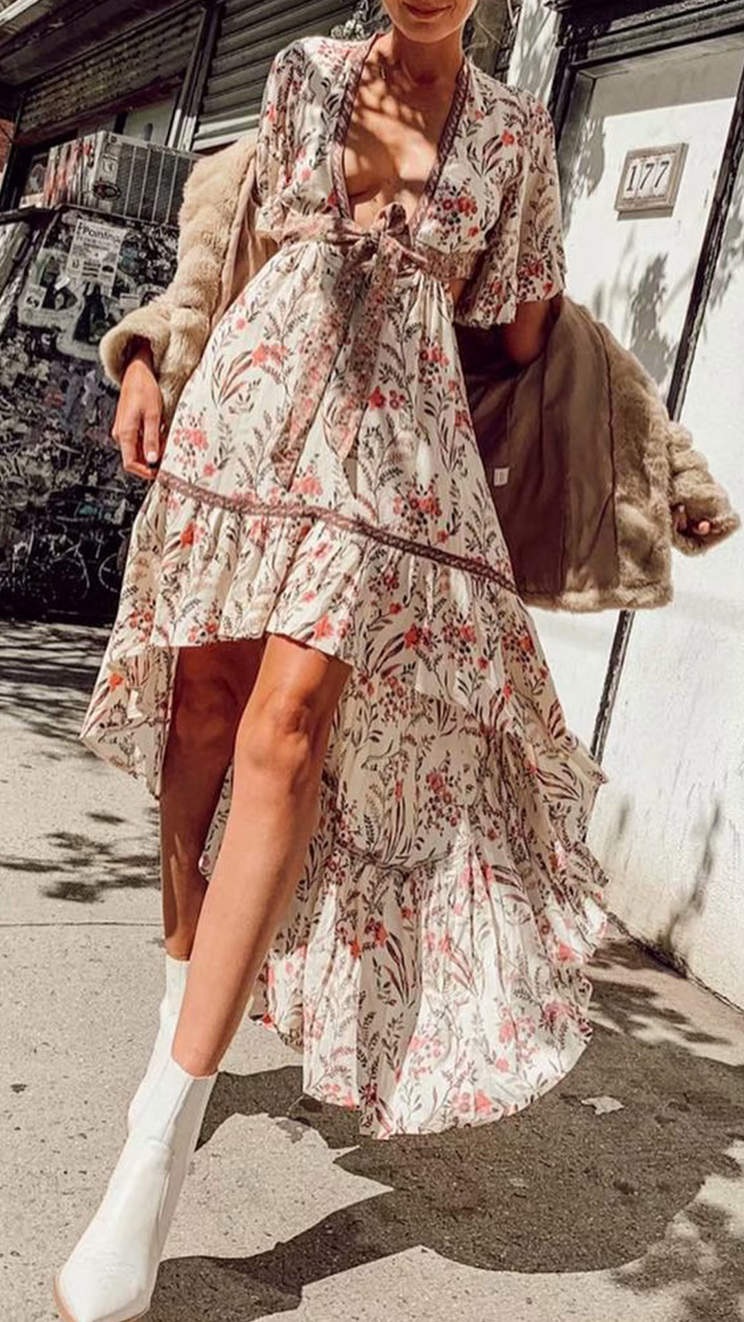 This beautiful bohemian-style dress is perfect for a day at the beach! The floral print is stunning, and the plunging v-neck and high-low hemline are both sexy and flattering. The front and back cutout details add a touch of fun and flirty, and the overall look is just perfect for a summer day.