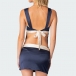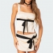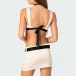 This daring and alluring two-piece set features a backless crop top with a bold, bow-like detail and a flirtatious mini skirt, creating a sultry and eye-catching ensemble. It is an ensemble that is typically reserved for club-centric occasions, where the wearer can embrace a daring and unapologetically sexy aesthetic.