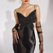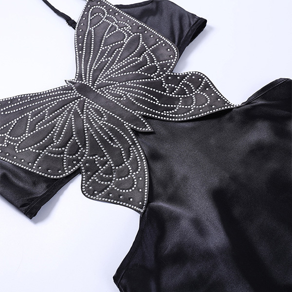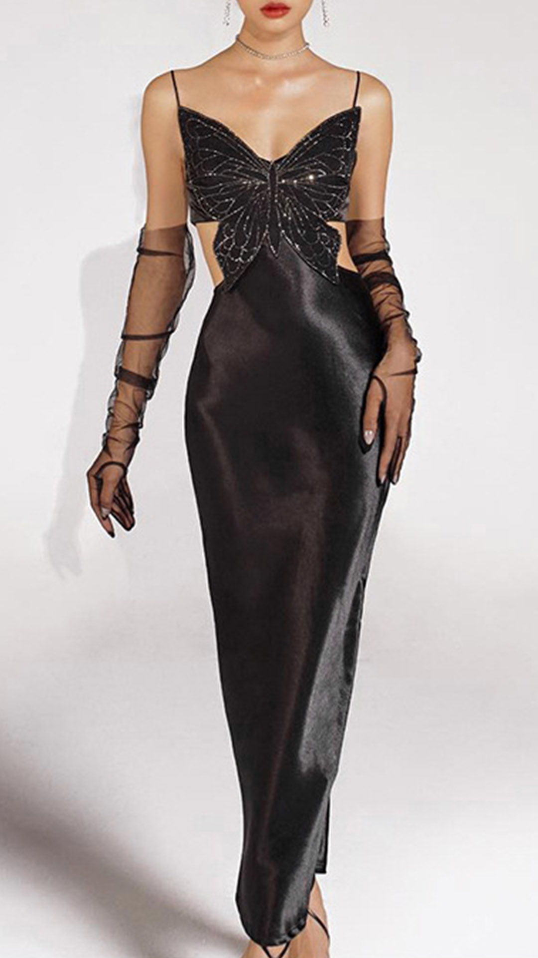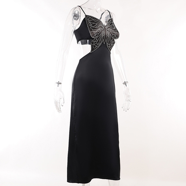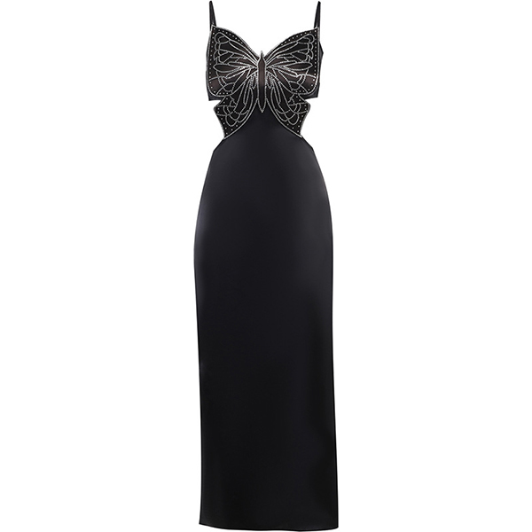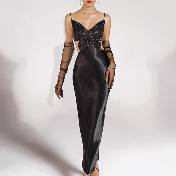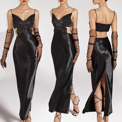 Wow, a sexy party dress! The dress features a stunning front butterfly cutout design that adds a touch of elegance and sexiness to the overall look. The side cutout and back slit detailing add a playful and flirty vibe, while the bodycon fit hugs your curves in all the right places.