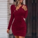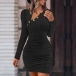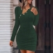 Sexy Buttoned Slant-neck Long Sleeve Ribbed Bodycon Dress