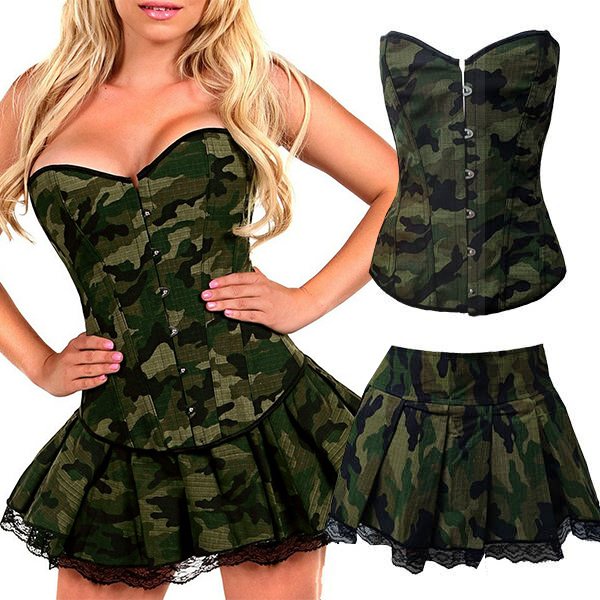 How about this two-piece corset set? The camouflage print adds a touch of edginess and uniqueness to this set, making it a standout piece in your wardrobe. It has a strapless corset and a lace splicing skirt which adds a delicate and feminine touch. The corset is designed to cinch your waist, creating a flattering hourglass silhouette. And the pleated skirt add some chic element to this set! Whether you're dressing up for a night out or adding a sexy twist to your lingerie collection, this camo printed set is sure to make a statement and make you feel confident and sexy.