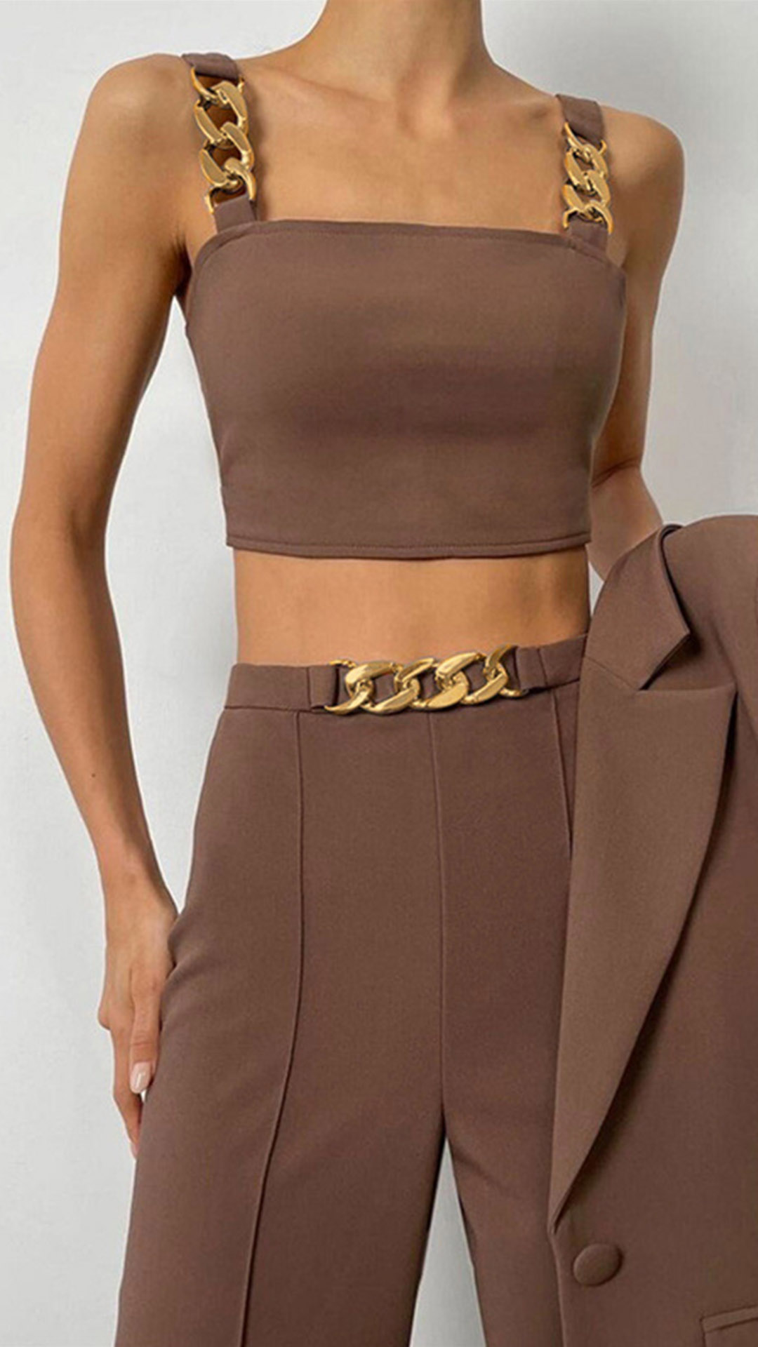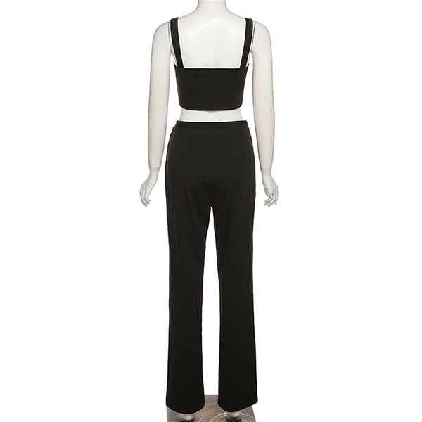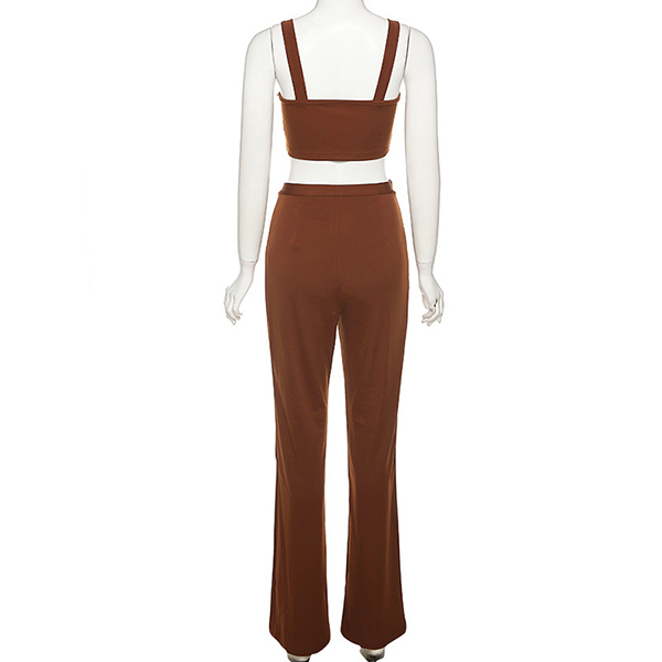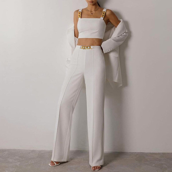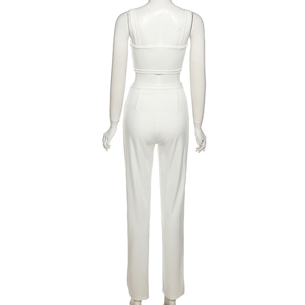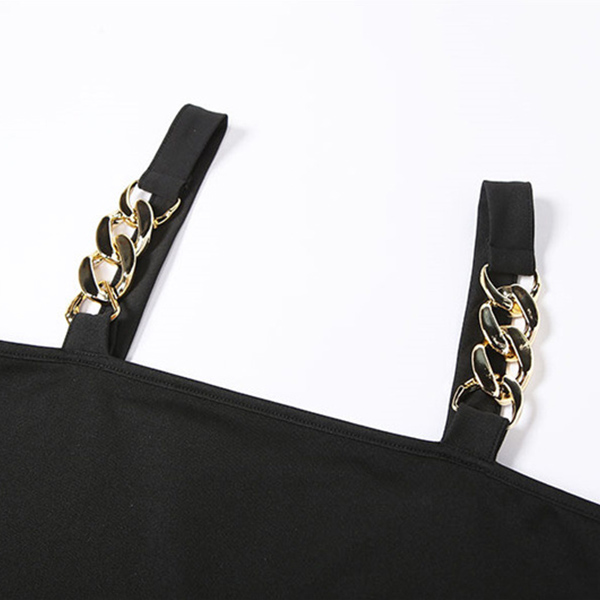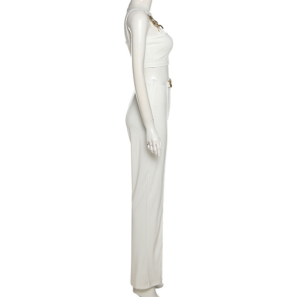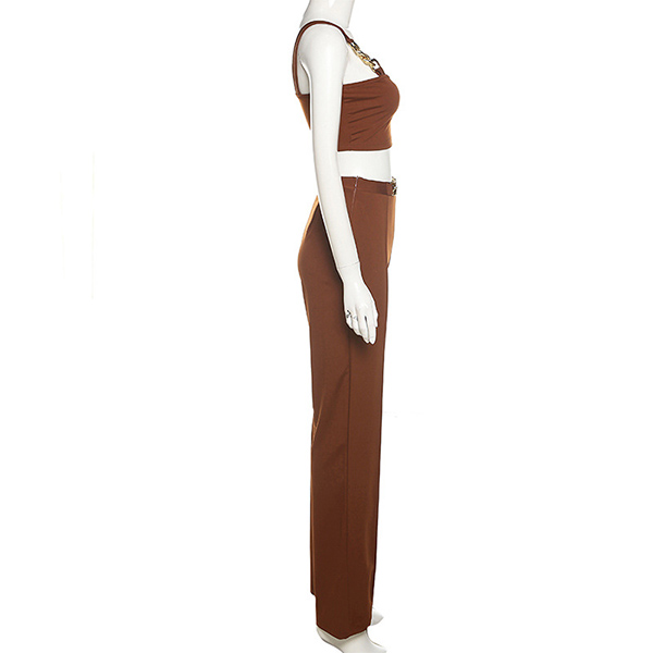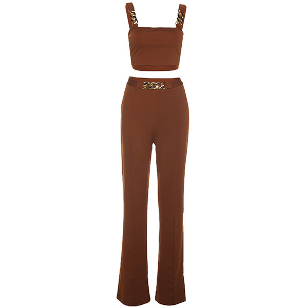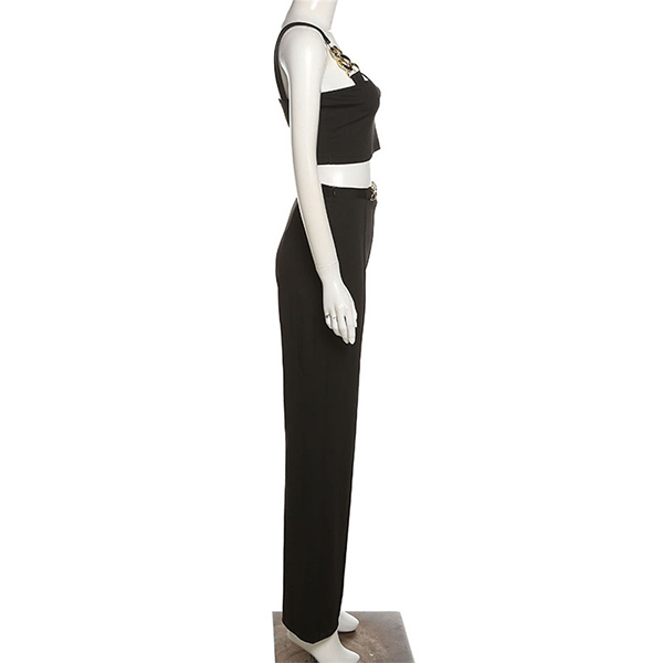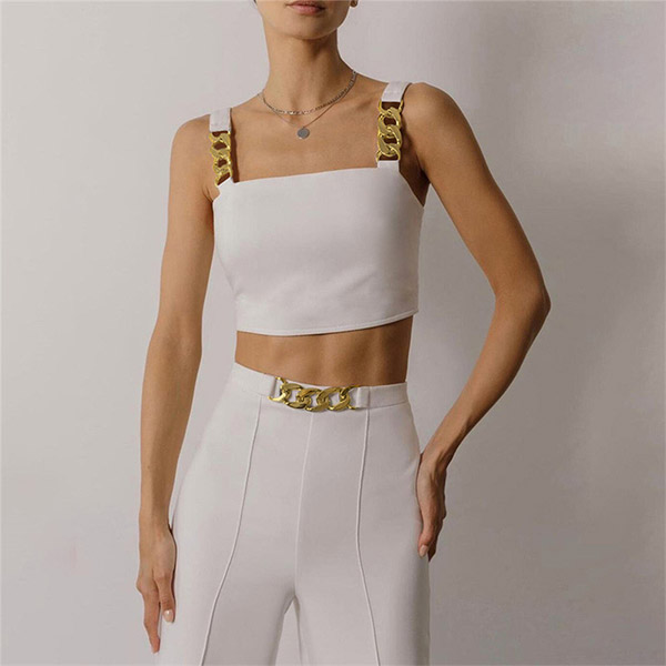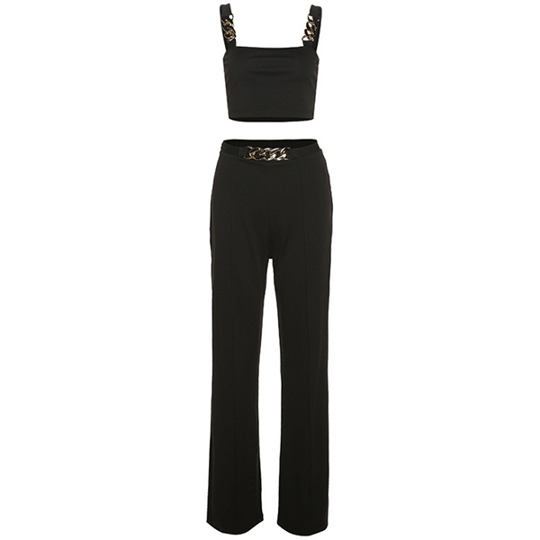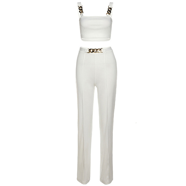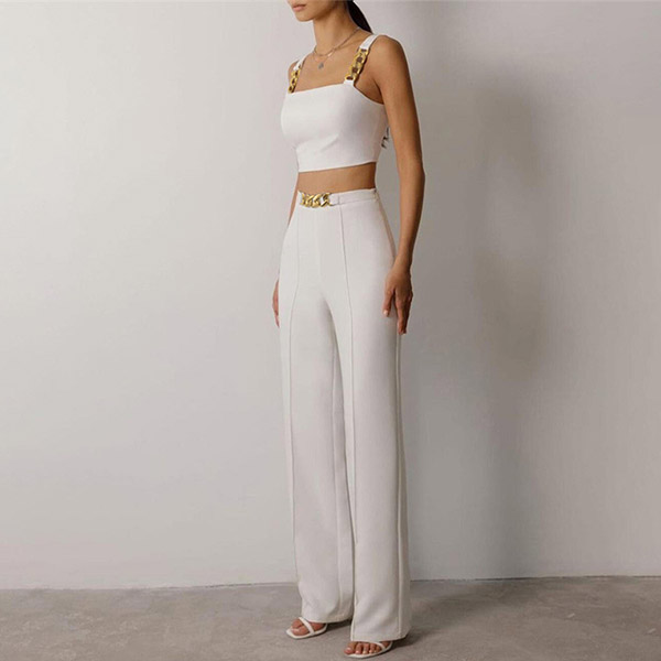 When you go out with this two-piece set,you can easily gain more eyes. Consists of a sling crop top and a high waist straight-leg pants,this two-piece set can help showcase your slender figure. Moreover,the chain design will add some extra charm. You can easily boost your charm by wearing this two-piece set.
