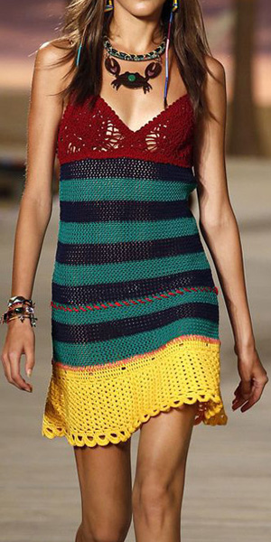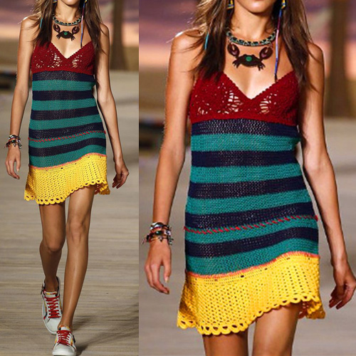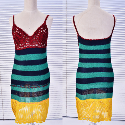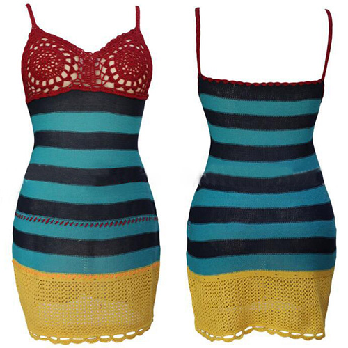 dress in the ensemble. It features open knit top, knitted color blocks-neck and sleeveless. Suit