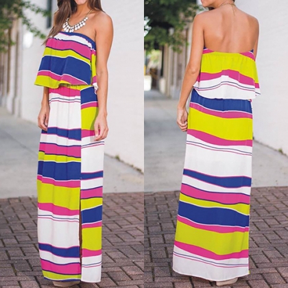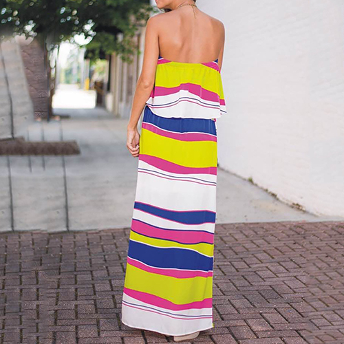 backless and colorful stripes and irregular hem. Filled with chic, sexy, stylish elements. Wear it to the seaside for an unforgettable trip.