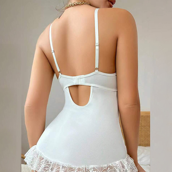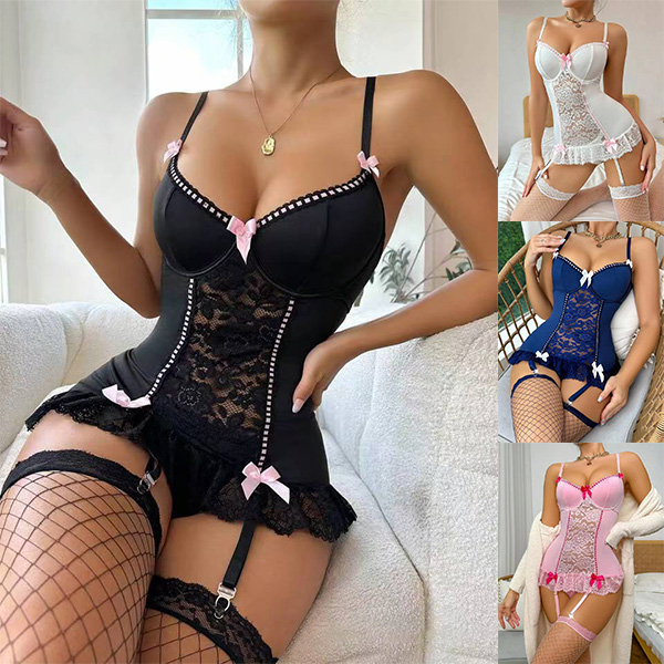 Sexy Contrast Color Bowknot Rhinestone Lace Spliced Lingerie Bodysuit