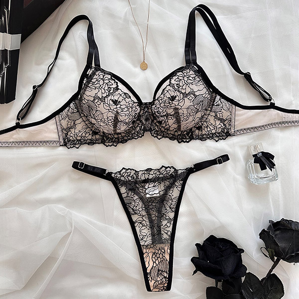 Sexy Contrast Color Floral Embroidered Two-piece Lingerie Set