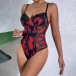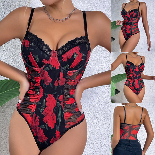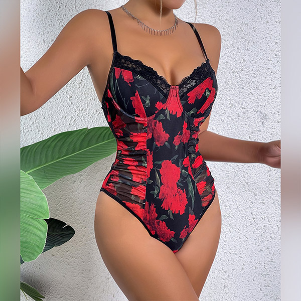 Sexy Contrast Color Floral Printed Lace Spliced Bodysuit