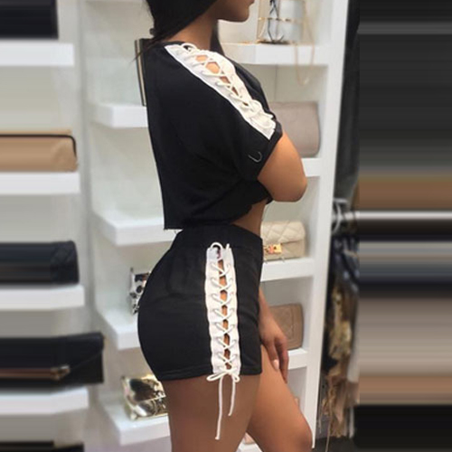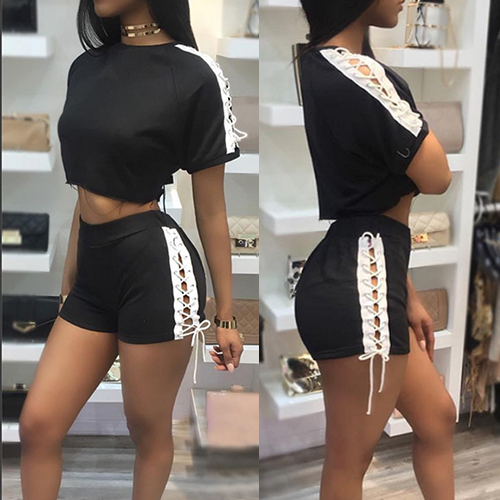 round neck crop top and a high waist shorts,both sides with hollow out lace-up design makes it look more distinctive.
