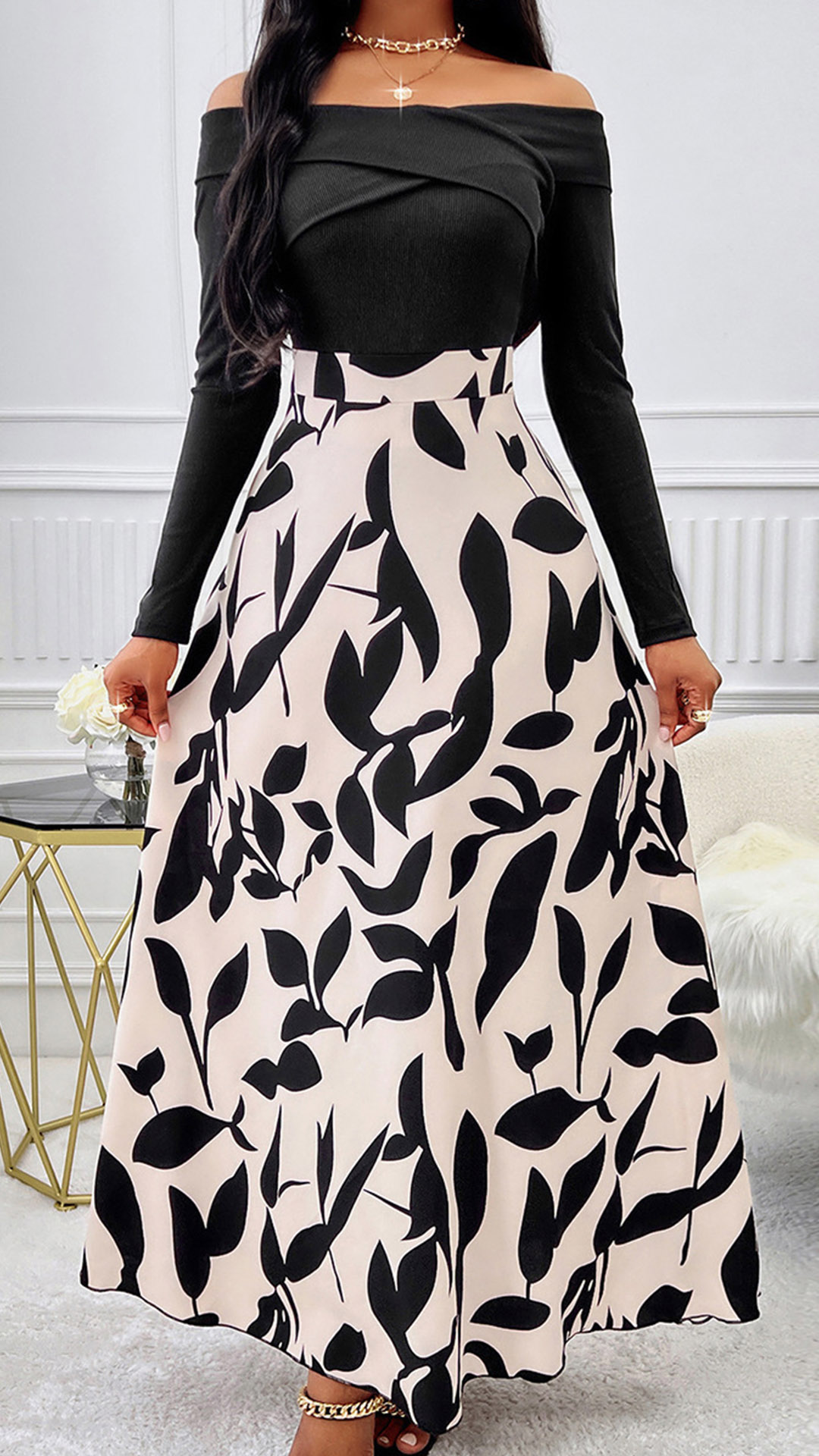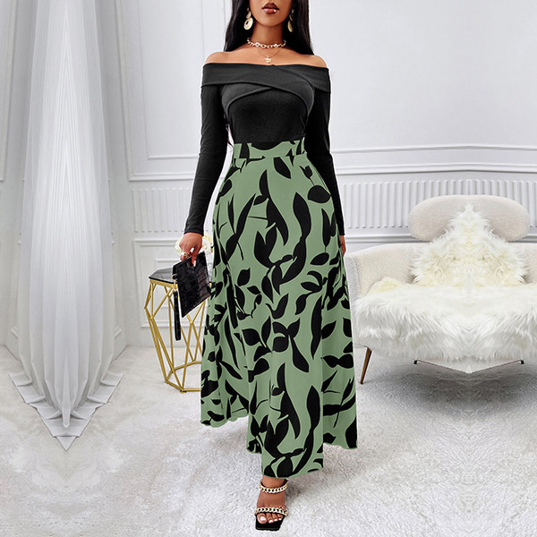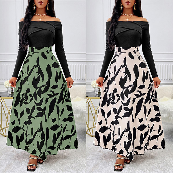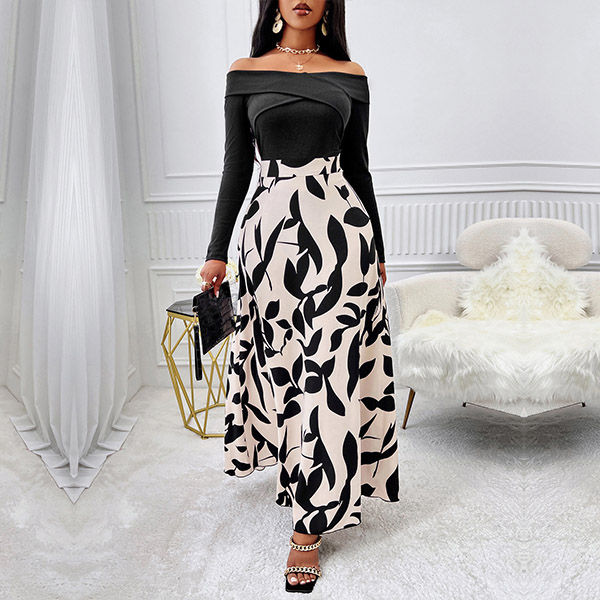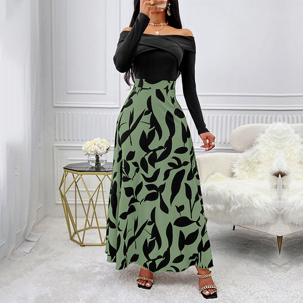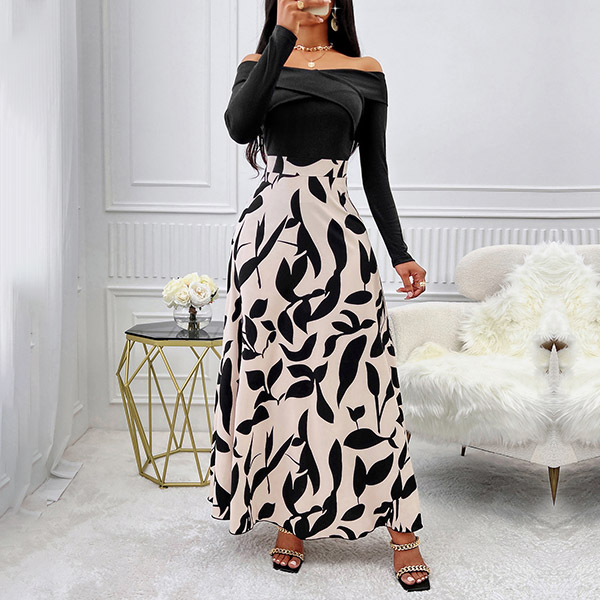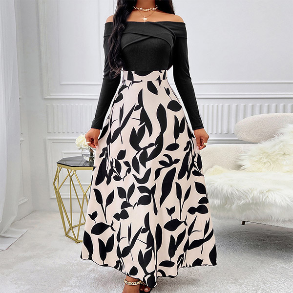 This dress features a contrast color design, black bodice with floral printed skirt! Its off-the-shoulder neckline, long sleeves, and a printed pattern along the skirt creating a bold and alluring look. Wanna have a try?