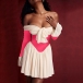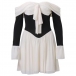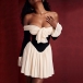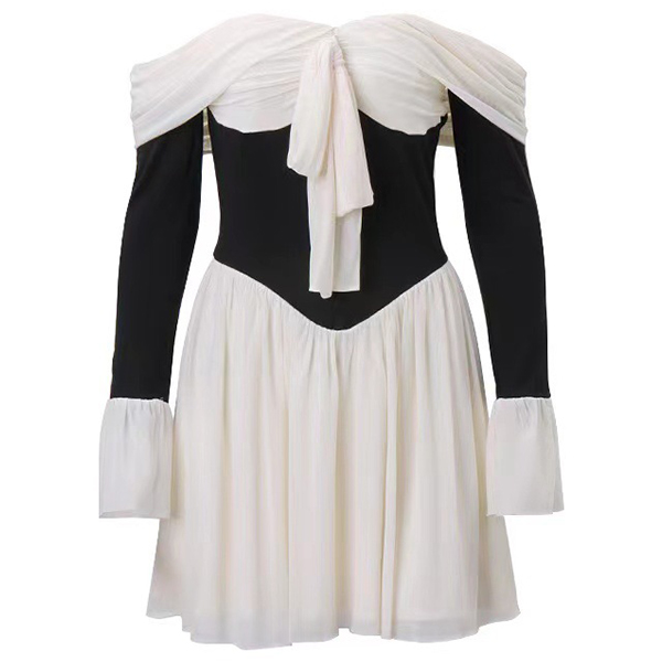 This is a bold and alluring piece that will make you the center of attention. The contrast color detailing adds a vibrant and eye-catching element, creating a captivating and fashion-forward look. The off-the-shoulder design showcases your shoulders and collarbone, adding a touch of sensuality and femininity to the dress. The ruffle detailing adds a playful and flirty touch, enhancing the overall appeal of the dress. Pair it with heels and statement accessories for a glamorous and head-turning look.