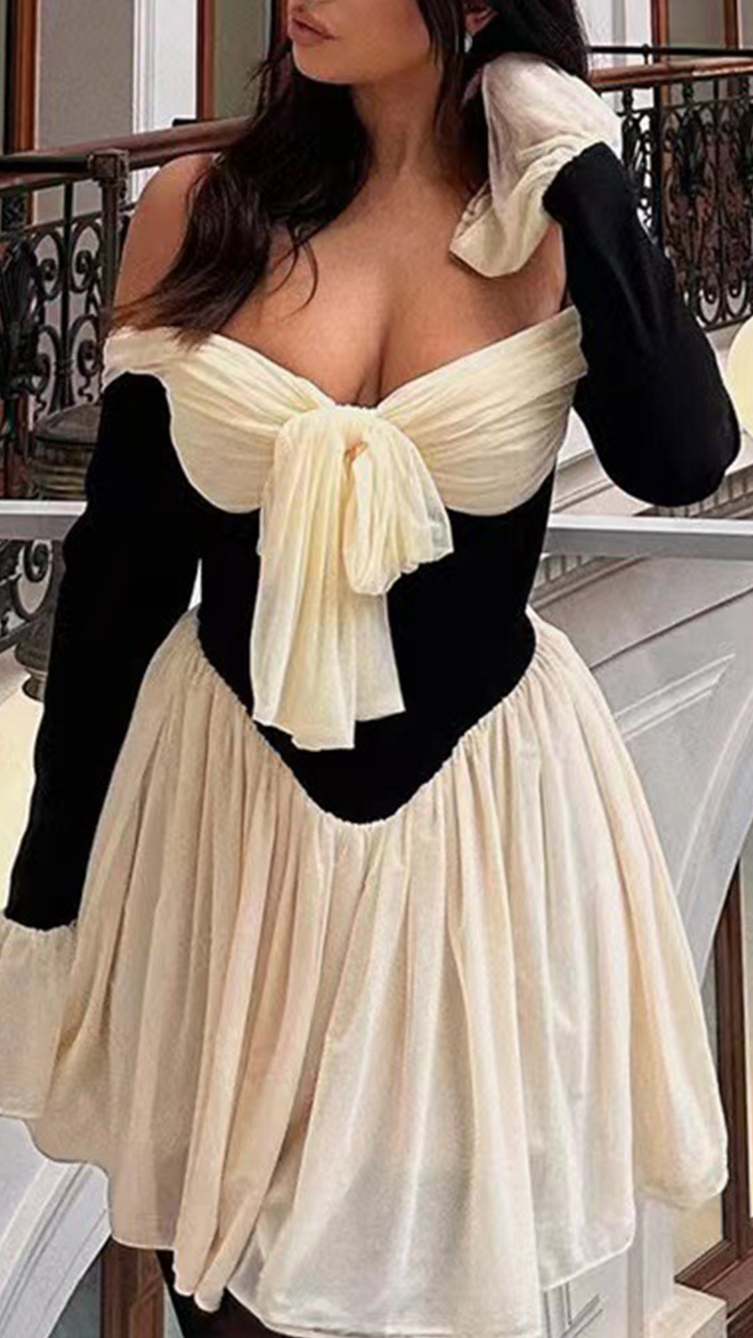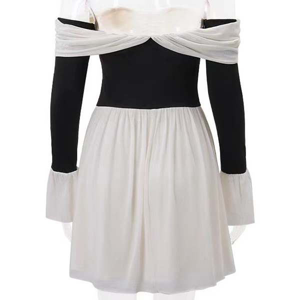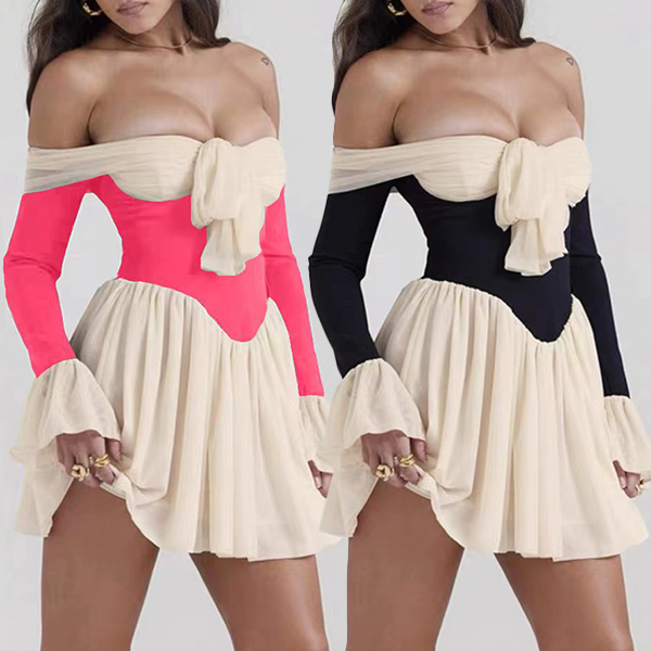 Sexy Contrast Color Off-the-shoulder Trumpet Long Sleeve Ruffle Mini Dress