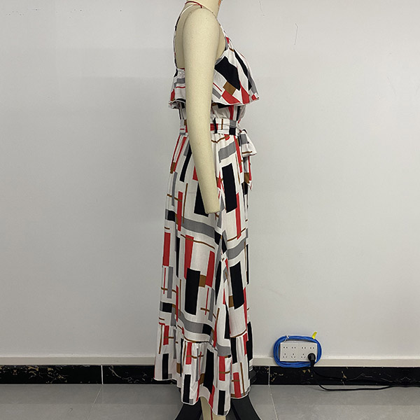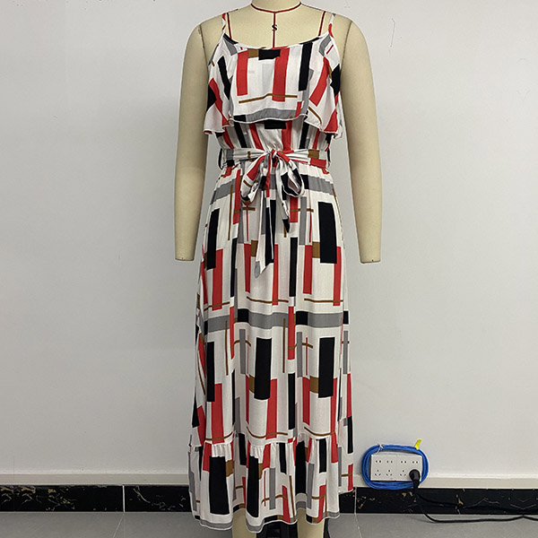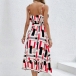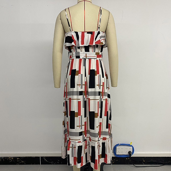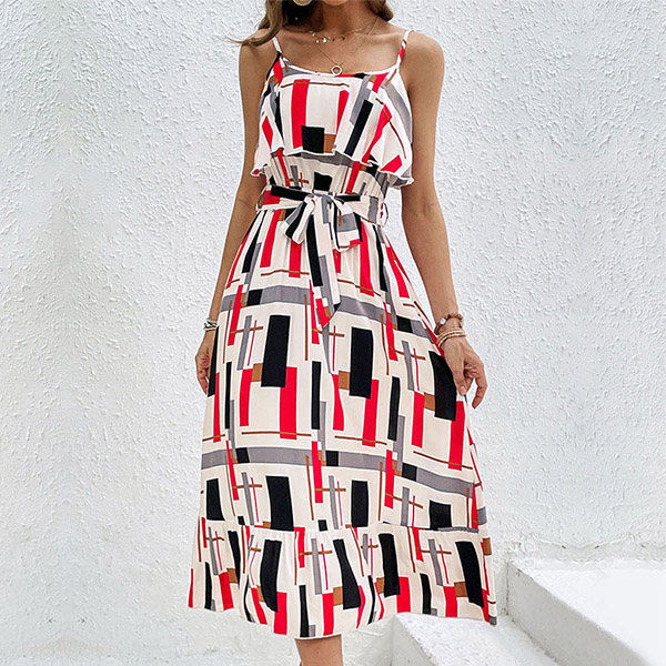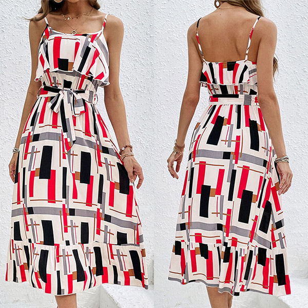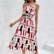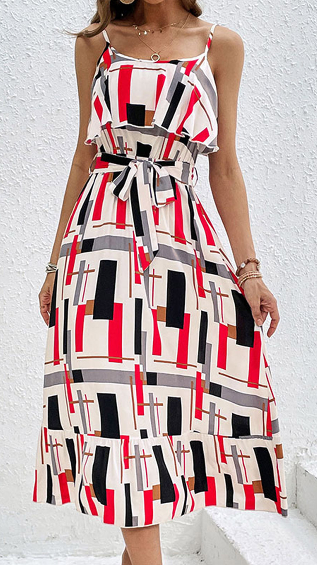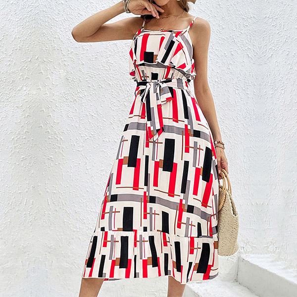 Sexy Contrast Color Printed Square Neck Self-tie Midi Dress