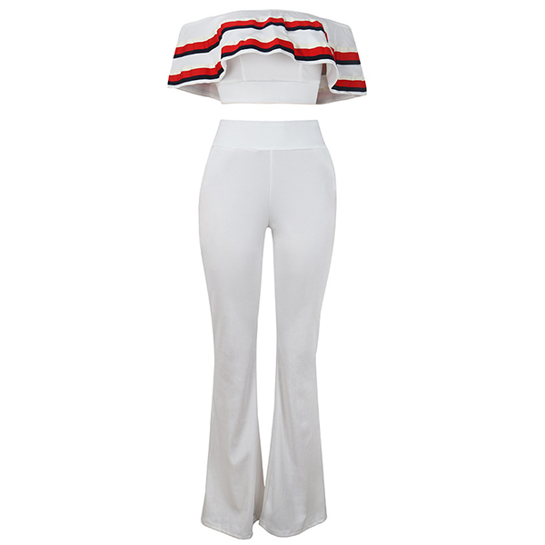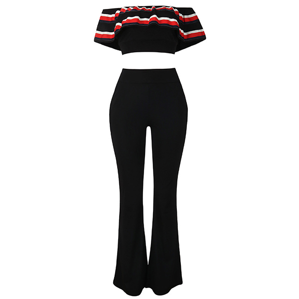 Seductive appeal and female charm comes easily with this two-piece set. Consists of an off-shoulder wide neckline ruffle crop