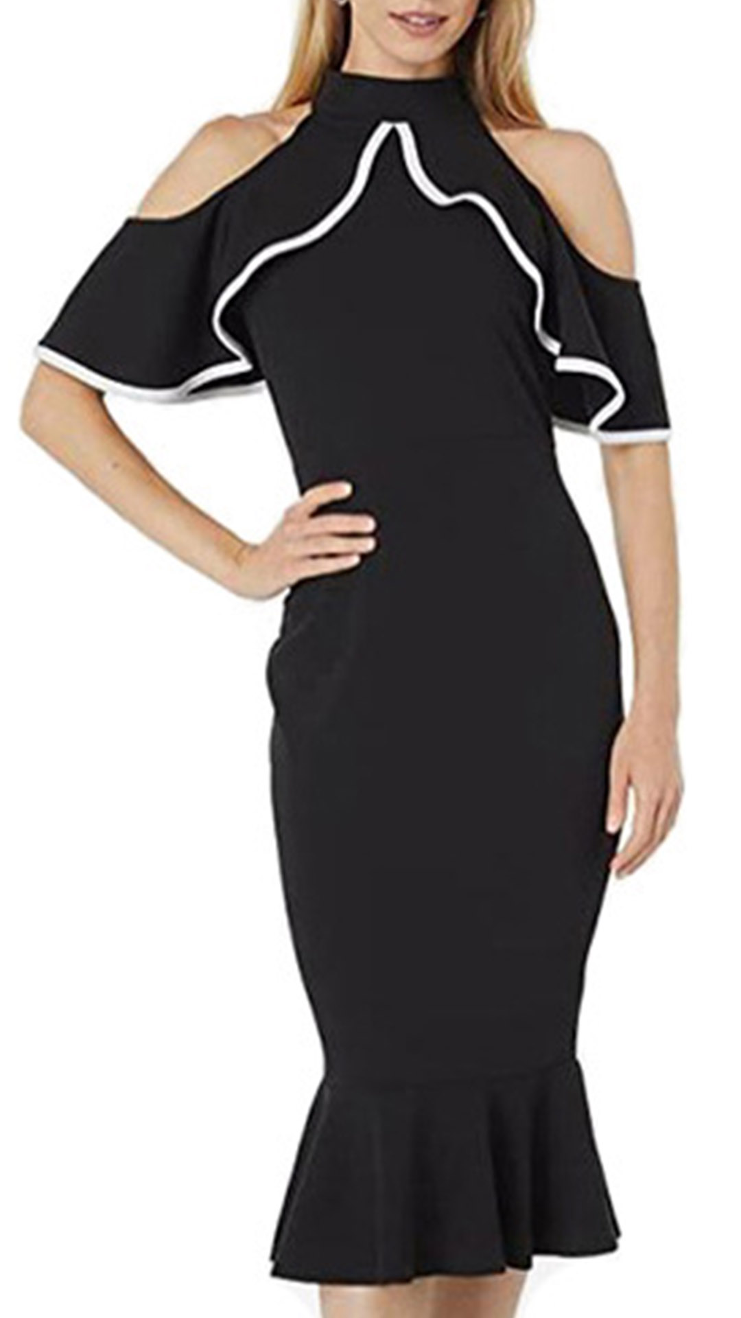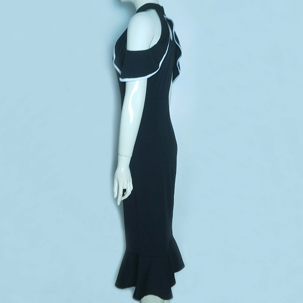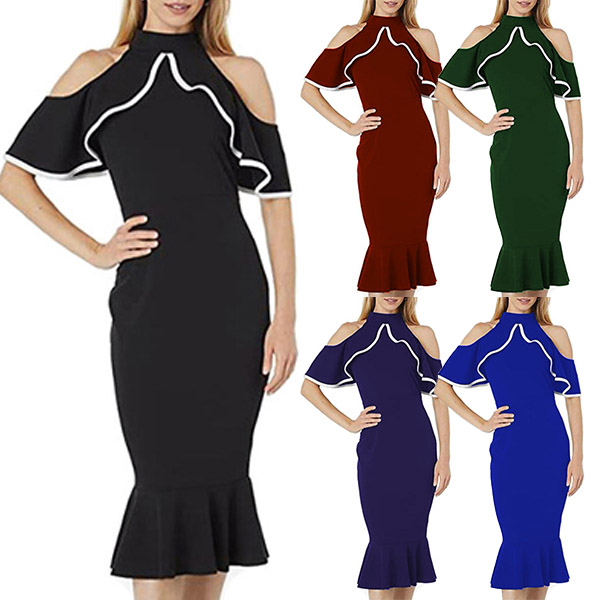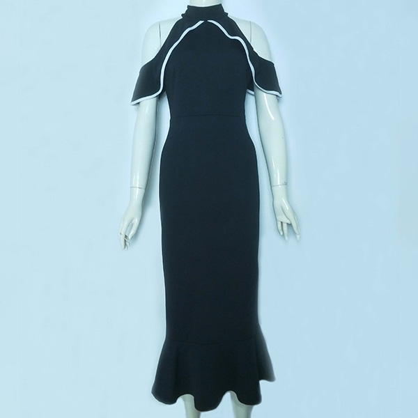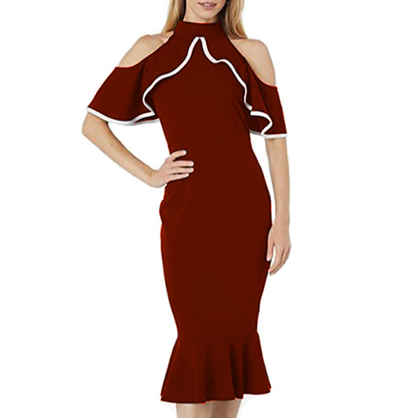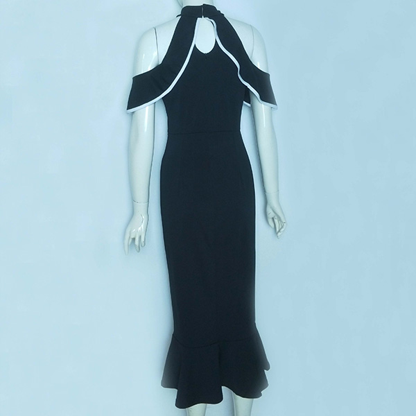 Sexy Contrast Color Ruffle Open Shoulder Mock Neck Bodycon Dress