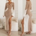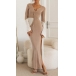 Sexy Contrast Color Self-tie Round Neck Long Sleeve Slit Ribbed Maxi Dress