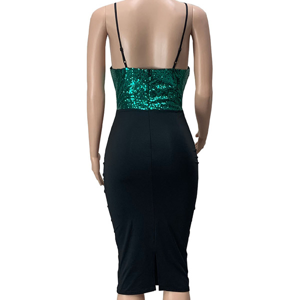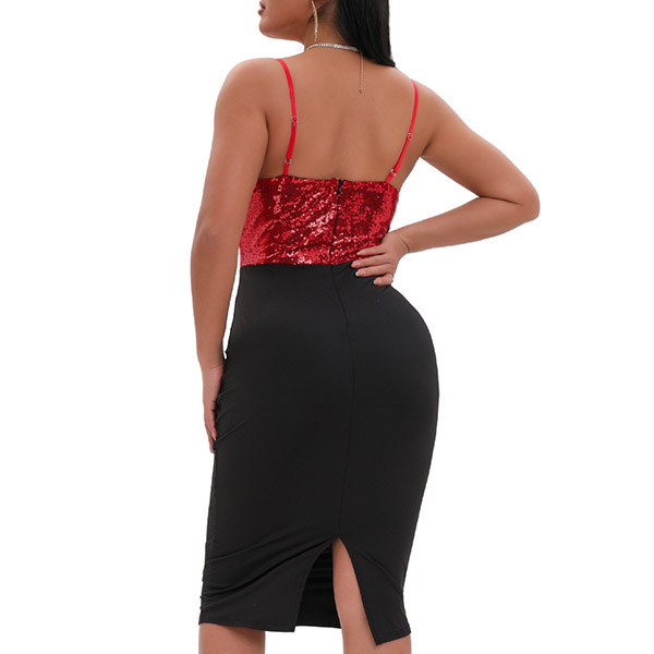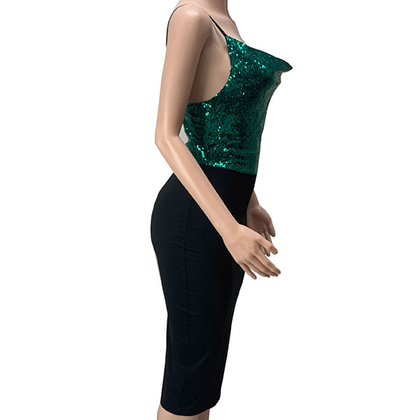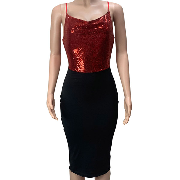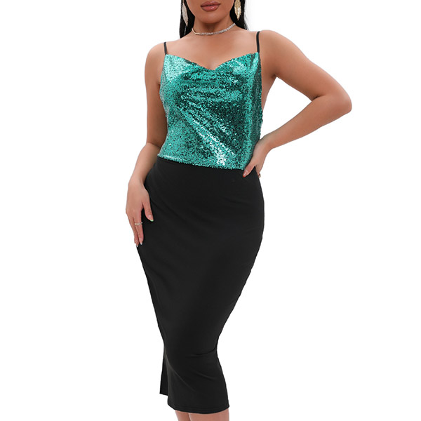 A sexy party dress features the contrast color sequined spliced design. Narrow shoulder strap for a front draped neckline. And the slim-fit silhouette to show your figure perfectly! This is the perfect dress for a night out on the town or a special event.