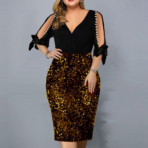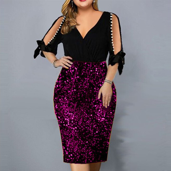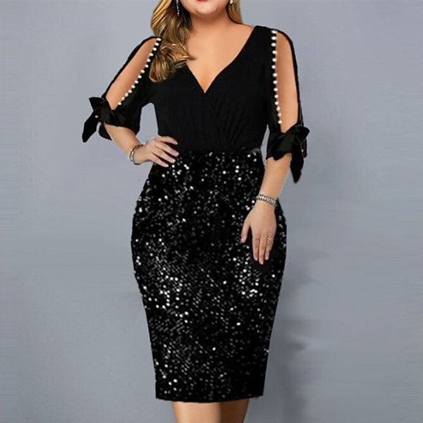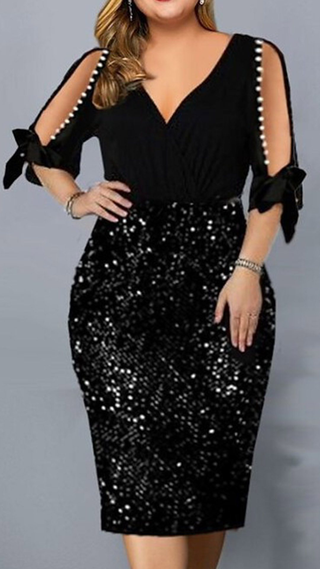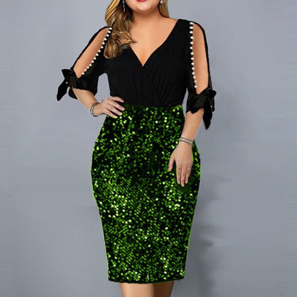 Sexy Contrast Color Sequined V-neck Open-shoulder Beaded Bodycon Party Dress