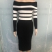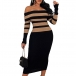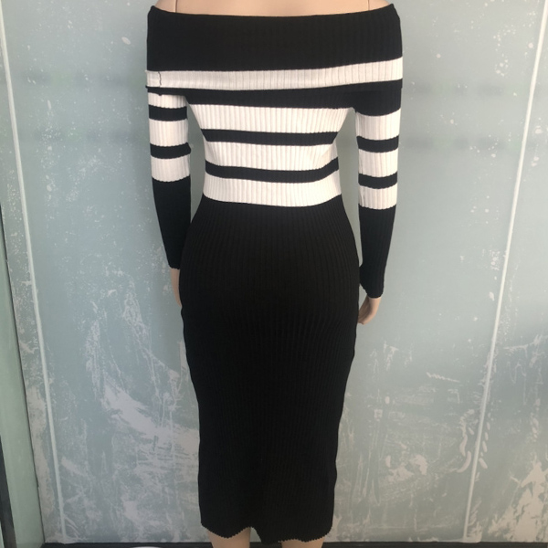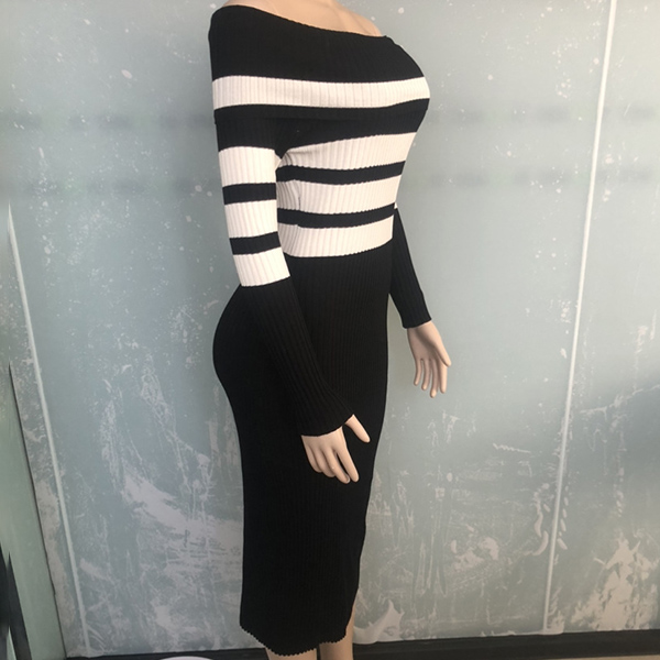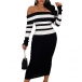 Sexy Contrast Color Stripe Off-the-shoulder Long Sleeve Bodycon Ribbed Dress