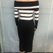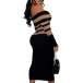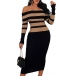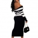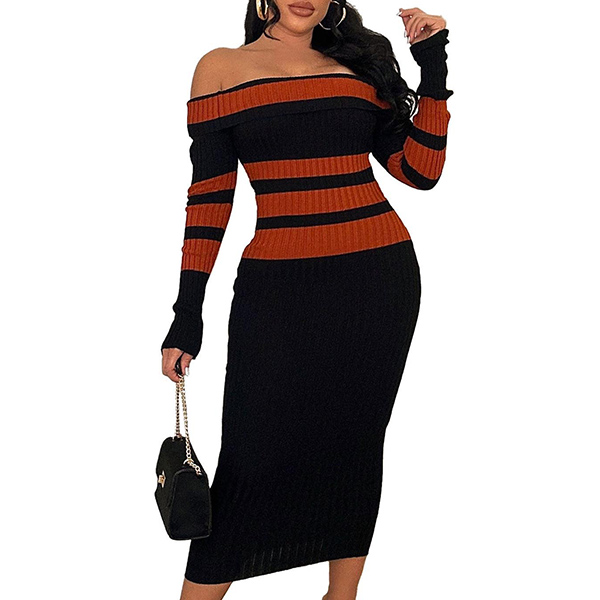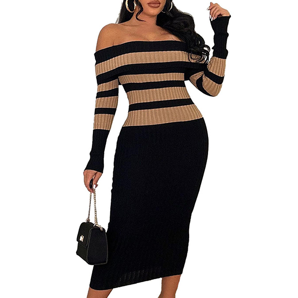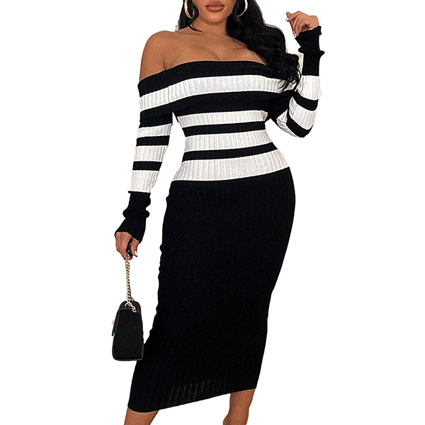 This is a bold and alluring dress that combines off-the-shoulder neckline, long sleeves, contrast color stripes, bodycon silhouette, and ribbed texture for a captivating and stylish look.