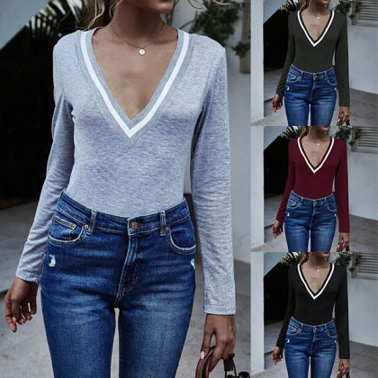 Thanks to the tight silhouette design,your slender figure can have a full display in this bodysuit. Contrast color and v-neck design make this piece look more attractive. So why not matching with your favourite pants to start your wonderful day?
