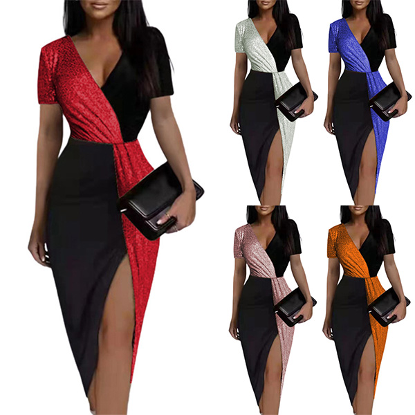 This dress features a flattering v-neckline and contrasting color block design that adds a touch of sophistication and glamour. The short sleeves and irregular hemline create a unique and trendy look, while the bodycon silhouette hugs your curves in all the right places, accentuating your figure. Perfect party choice!