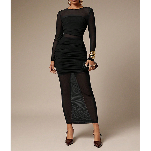 How about this dress? Strategic ruching creates gorgeous texture and a figure-flattering effect that accentuates your curves in all the right places. Long sleeves provide elegant coverage, while semi-sheer fabric adds a hint of mystery and sensual appeal. The classic crew neckline keeps the look sophisticated, allowing the body-hugging silhouette and translucent details to make their statement. This dress is perfect for date nights, club outings, or any occasion where you want to feel irresistibly sexy and glamorous. Hope you like it.