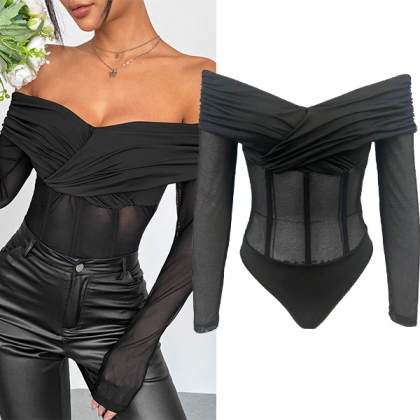 This bodysuit features a cross strapless design, long sleeves, semi-sheer fabric, and corset-inspired silhouette for a sultry and stylish look. Pair with jeans or skirt for a sexy look~