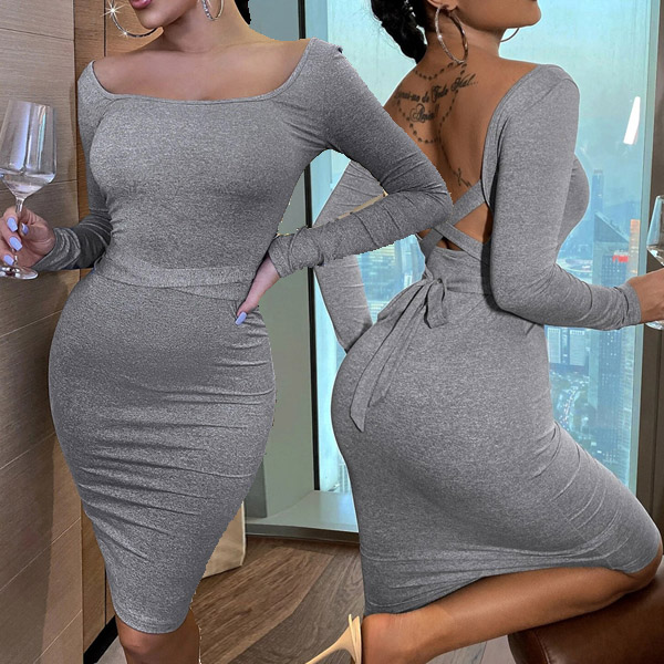 Sexy Crossover Lace-up Backless Long Sleeve Round Neck Solid Color Tight Dress