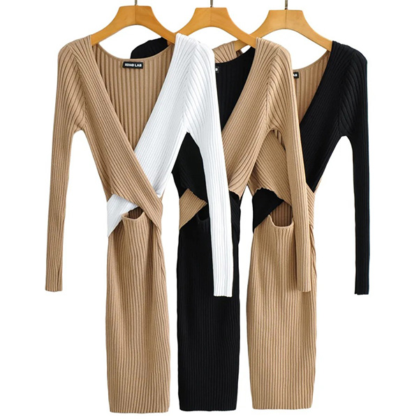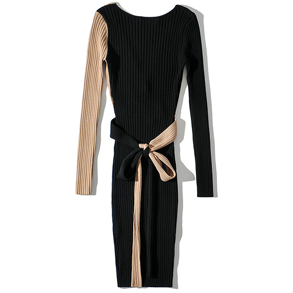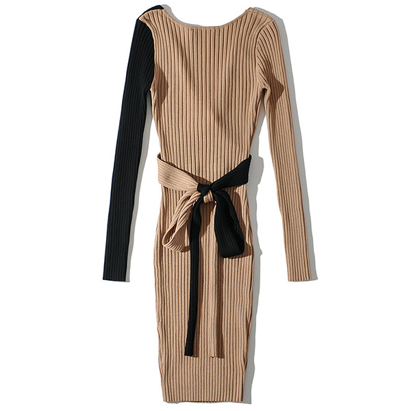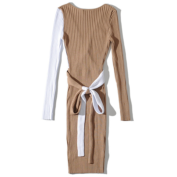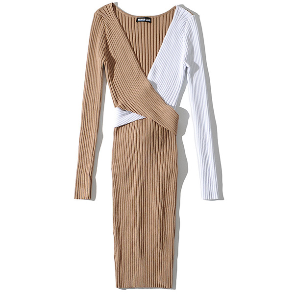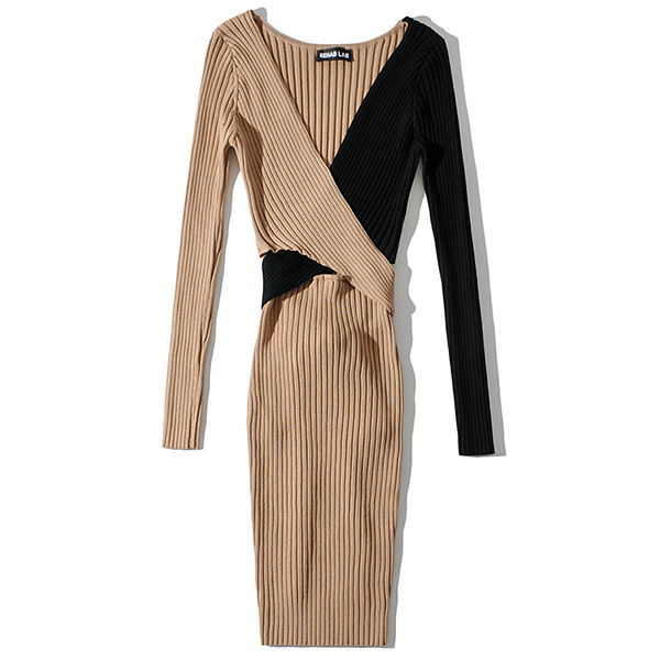 Sexy Crossover V-neck Long Sleeve Contrast Color Slim Fit Knit Dress