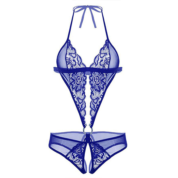Sexy Cut Out Semi-through Lace Spliced Gauze Backless Halter Neck Lingerie Bodysuit