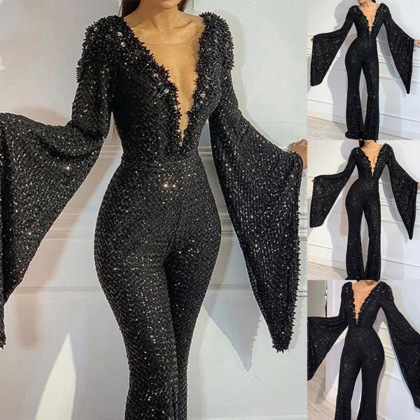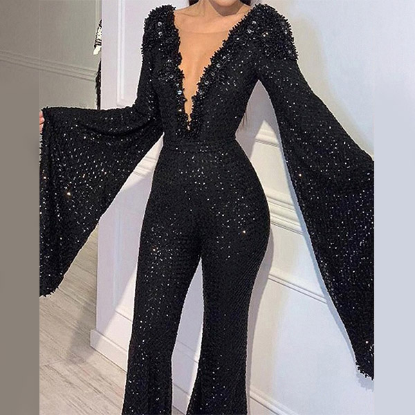 Sexy Deep V-neck Dolman Sleeve High Waist Sequin Slim Fit Jumpsuit