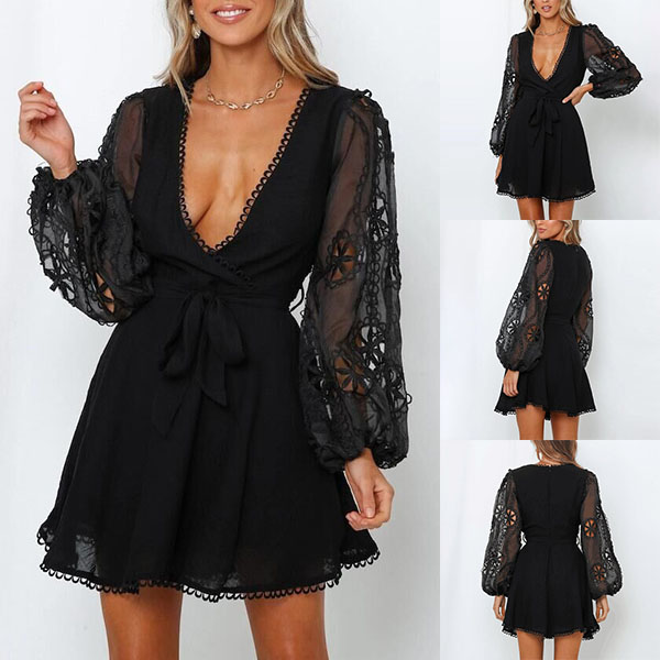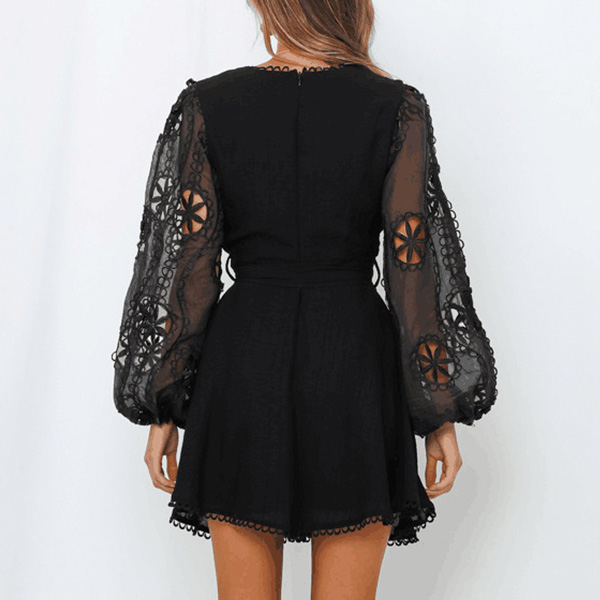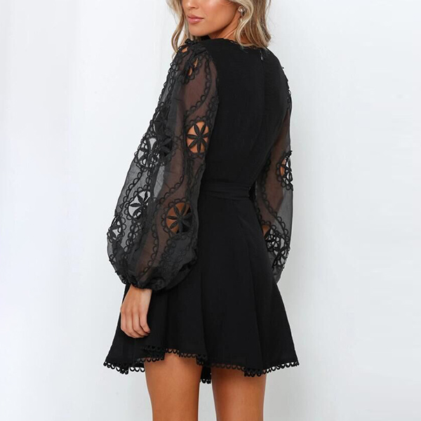 Sexy Deep V-neck Gauze Spliced Lantern Sleeve Dress