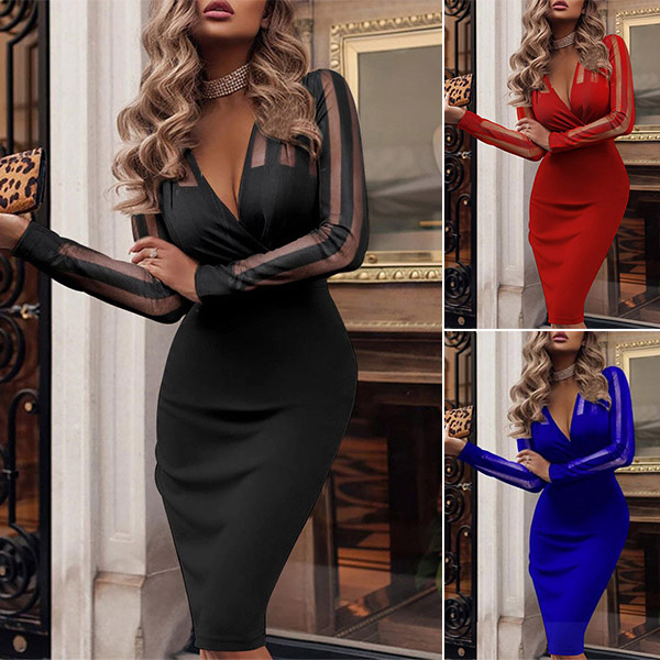 Sexy Deep V-neck Gauze Spliced Long Sleeve High Waist Slim Fit Dress