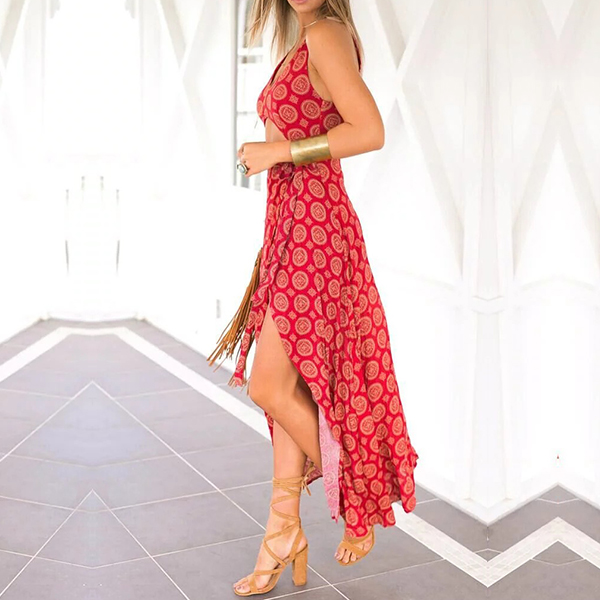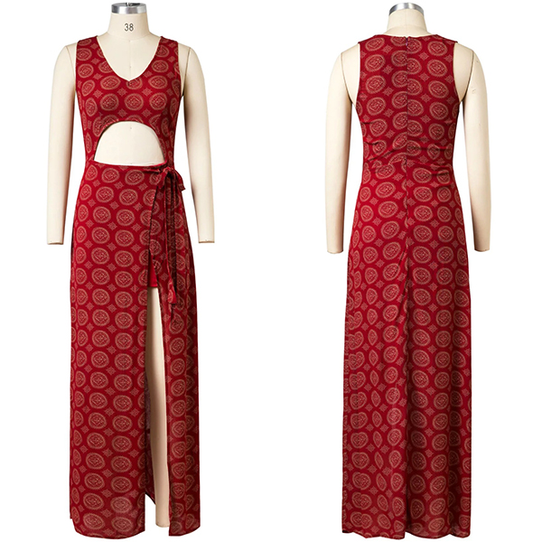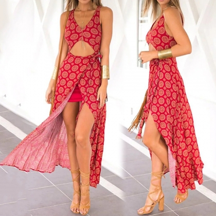 dress on hand. Features chic and eye-catching printed pattern,with deep v-neck,hollow out high waist and slit hem design,