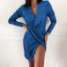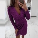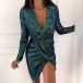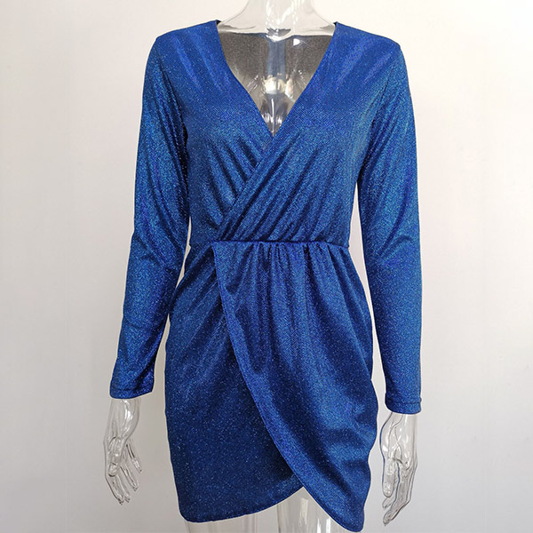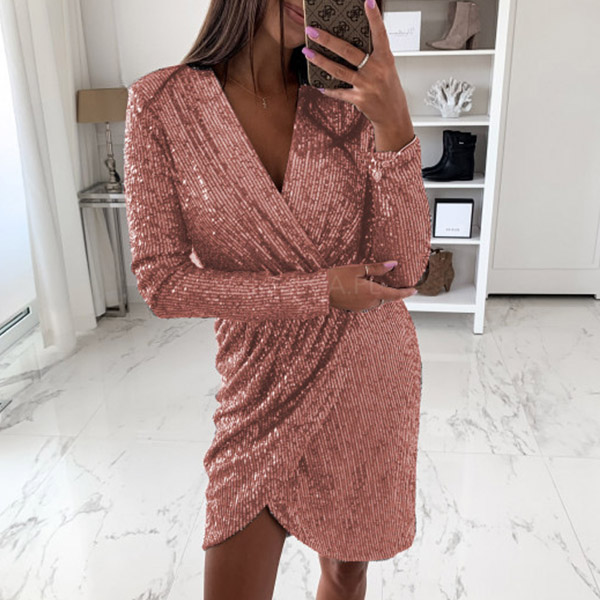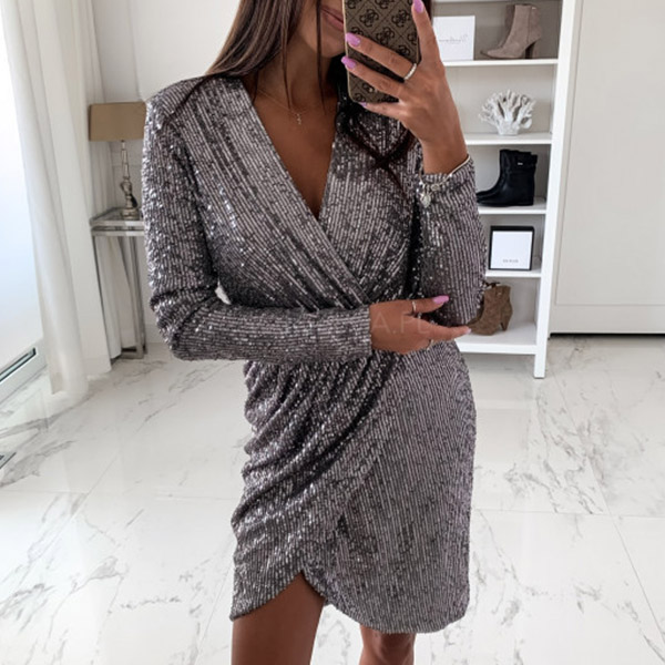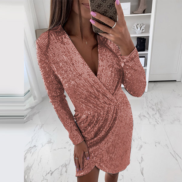 Sexy Deep V-neck Irregular Hem Long Sleeve Slim Fit Sequin Mini Dress