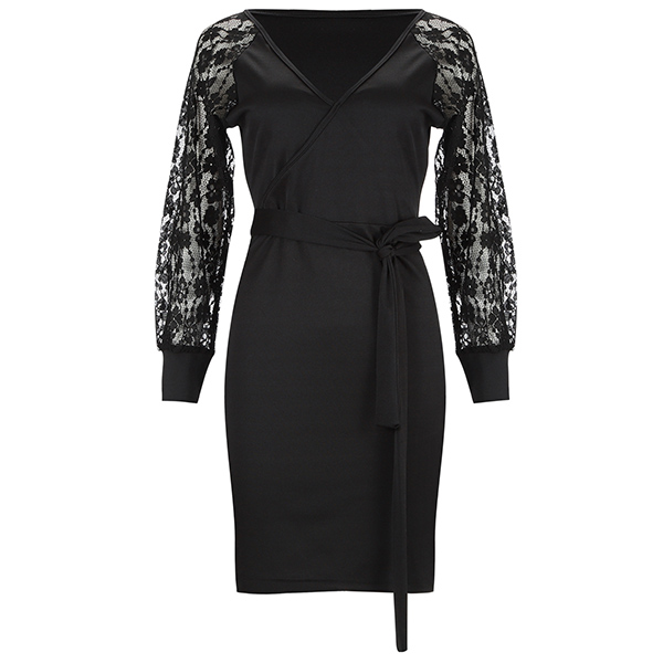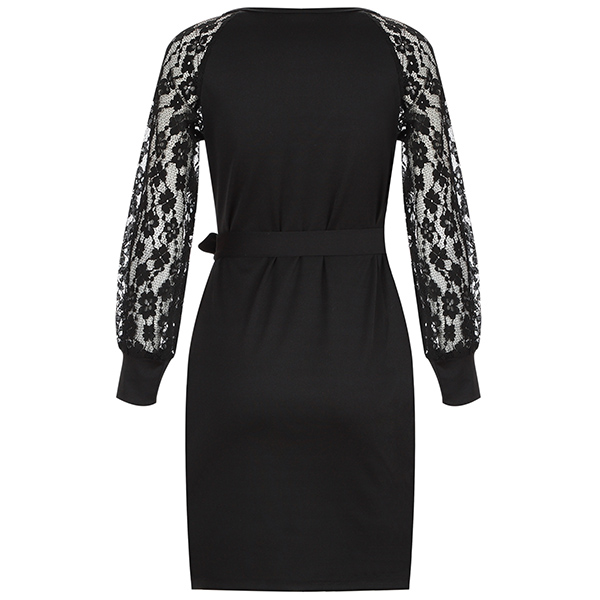 Still worryng abiout what to wear for your night dating and weekend gatherings? Then you can make your eyes focused on this party dress. The deep v-neck and lace spliced long sleeve design make this piece look so sexy and alluring,while the fit silhouette and tie-belt design at the waist part can better showcase your slender figure. You can just slip into this dress to express your beauty and charm.