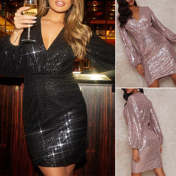 Hey,girls,you are sure to stand out in the crowd when you wear this dress. The sequin details make it look so shinning. Finished with lantern sleeve,deep v-neck,an irregular hem and a fit silhouette,this dress not only can showcase your slender figure,but also can exude your flirty side. Dress it up with your sexy heels and elegant clutch for an amazing look!