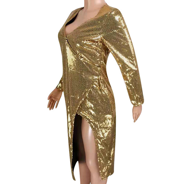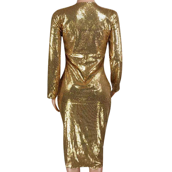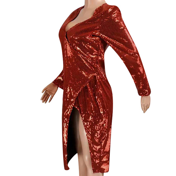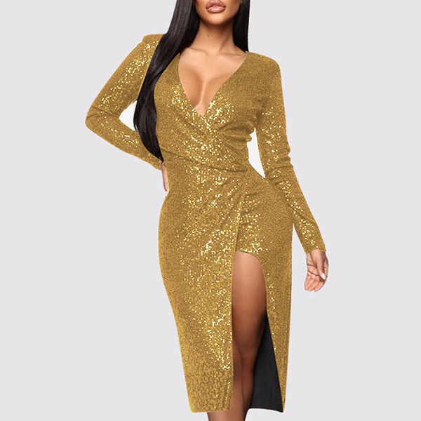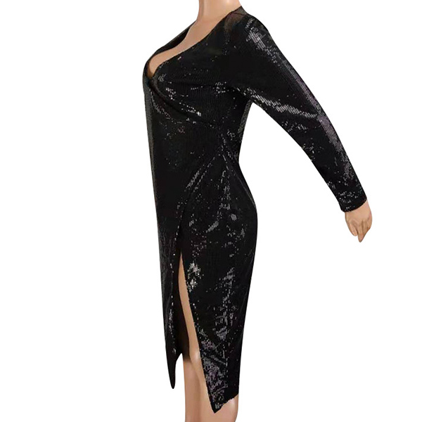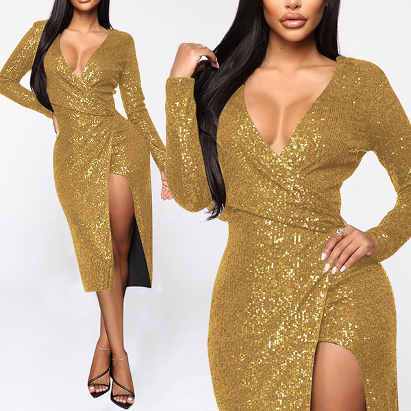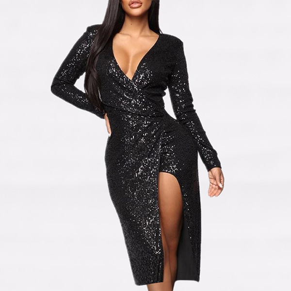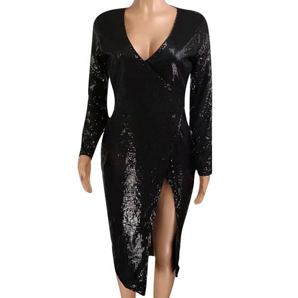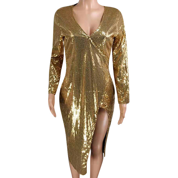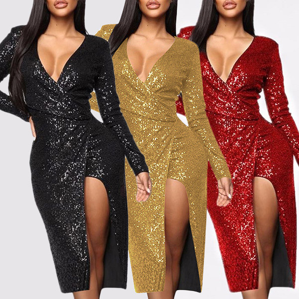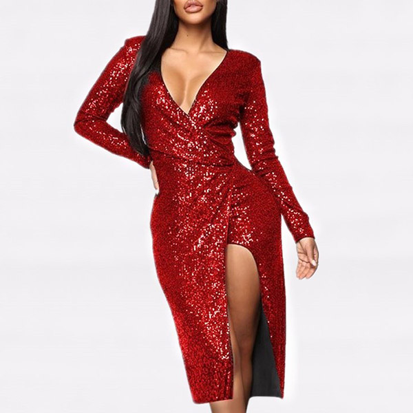 Sexy Deep V-neck Lantern Sleeve Slim Fit Sequin Party Dress