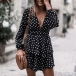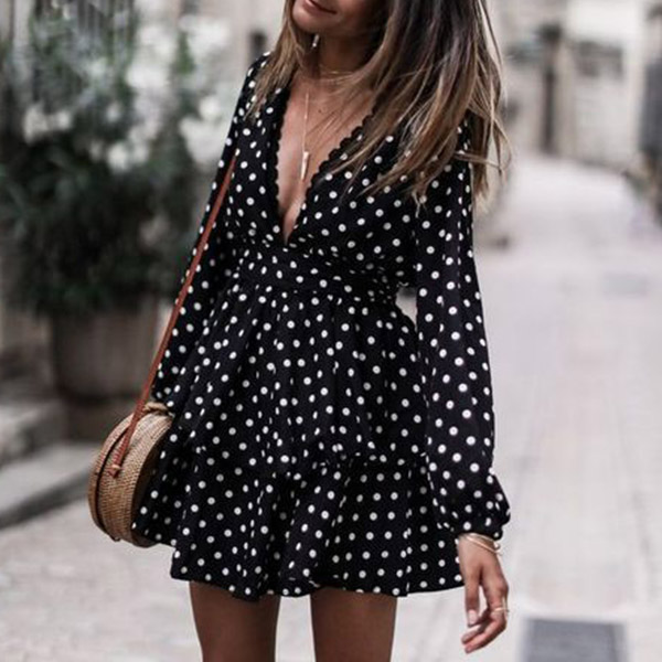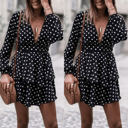 Sexy Deep V-neck Long Sleeve High Waist Dots Printed Dress
