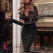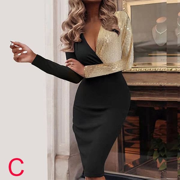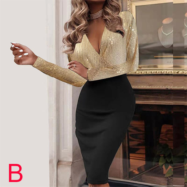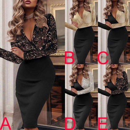 Sexy Deep V-neck Long Sleeve High Waist Slim Fit Sequin Party Dress
