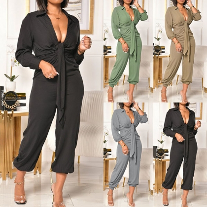 Sexy Deep V-neck Long Sleeve High Waist Solid Color Jumpsuit