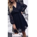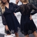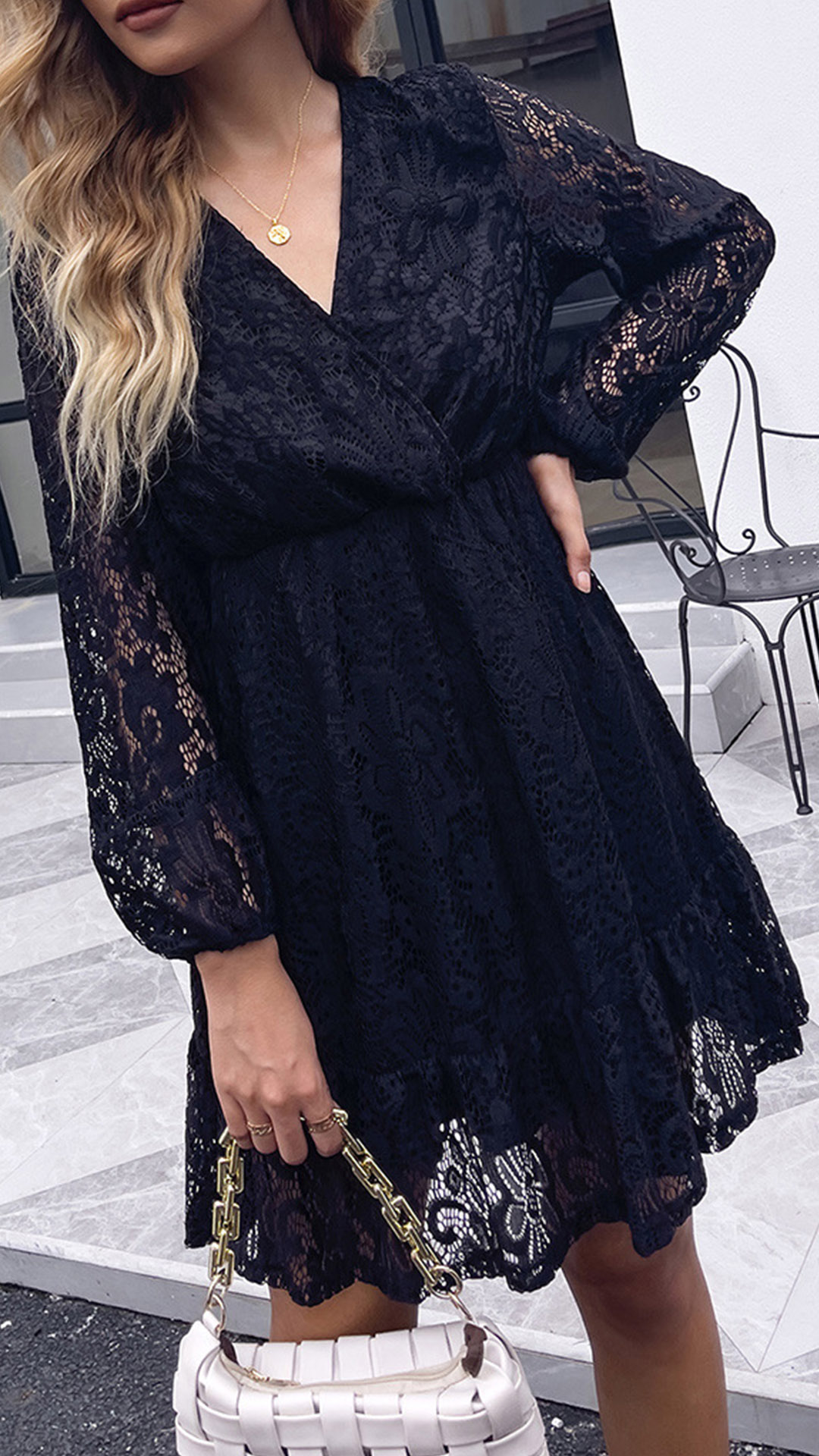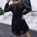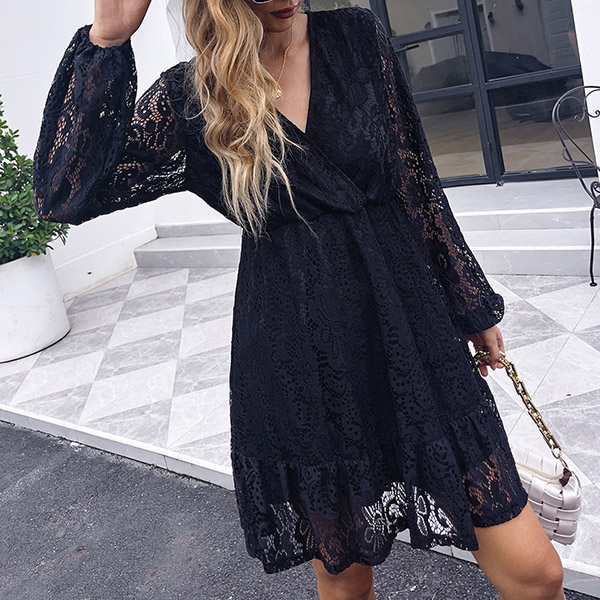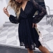 Sexy Deep V-neck Long Sleeve High Waist Solid Color Lace Dress